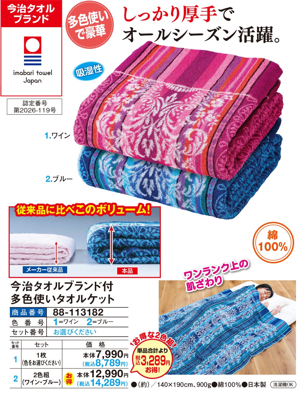 しっかり厚手でオールシーズン活躍! 【今治タオルブランド】 「今治タオル工業組合」が独自の品質基準をクリアした商品のみに許可する「imabari towel」のネームが付いています。 ◆認定番号:第2026-119号 多色使いで豪華 従来品に比べこのボリューム! ワンランク上の肌ざわり ●吸湿性