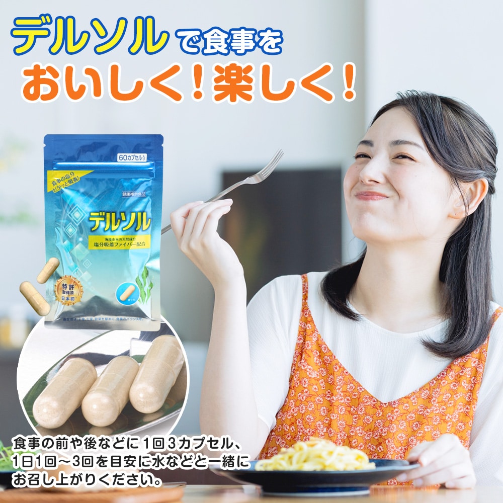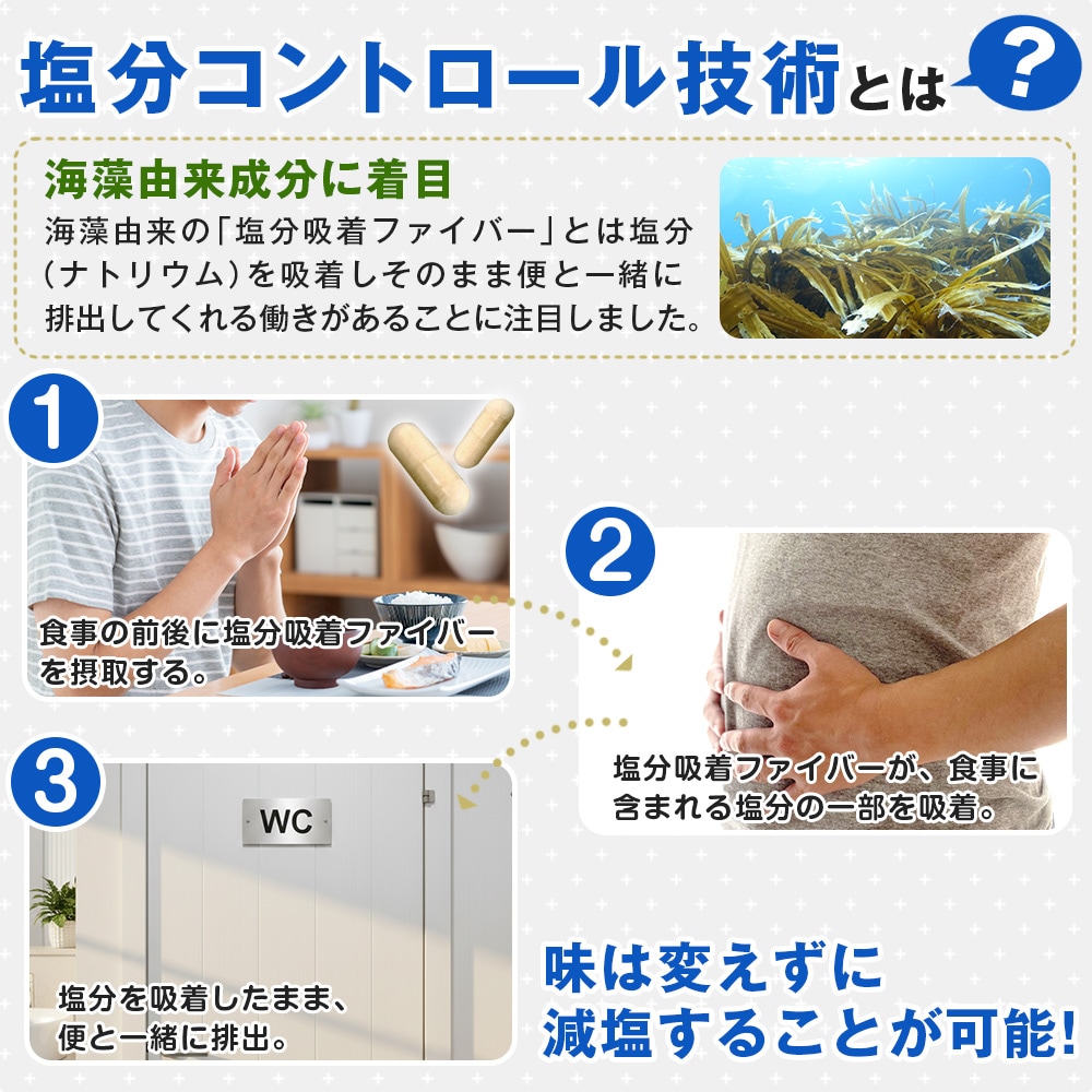 これまでの減塩とは違う、新しいアプローチ。 食事の塩分ピタッと吸着! おいしいも、健康も。妥協したくあいあなたへ。 「塩分吸着ファイバー」配合サプリメント。 塩分吸着パウダーを配合したサプリメント。 カリウムは一切使用しておりませんので、カリウムが気になる方にも安心してお召し上がりいただけます。