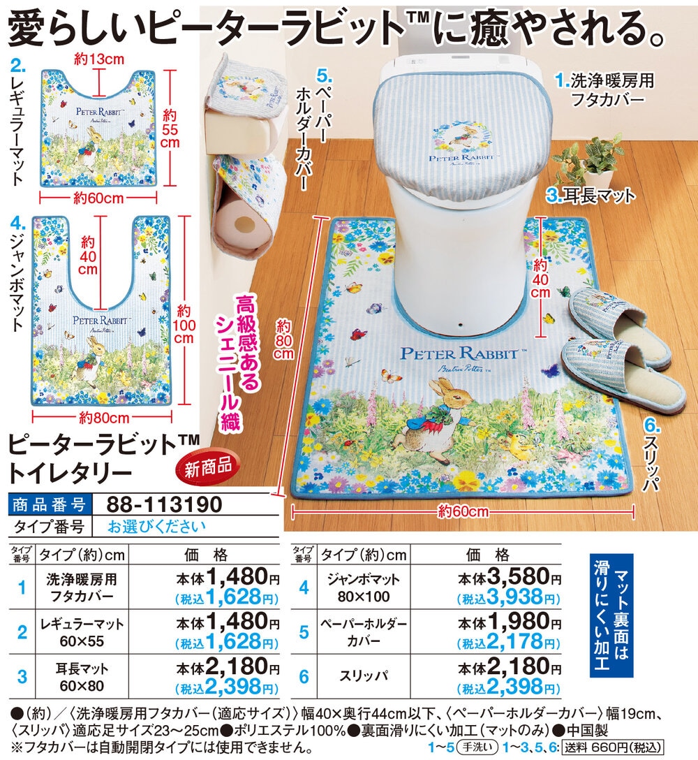 ●(約)/<洗浄暖房用フタカバー(適応サイズ)>幅40×奥行44cm以下、<ペーパーホルダーカバー>幅19cm、<スリッパ>適応足サイズ23~25cm ●ポリエステル100% ●裏面滑りにくい加工(マットのみ) ●中国製 ※フタカバーは自動開閉タイプには使用できません。