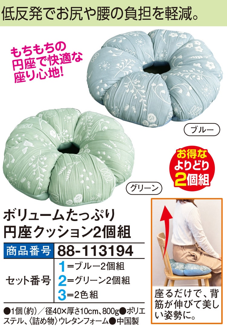 ●1個(約)/径40×厚さ10cm、800g ●ポリエステル、<詰め物>ウレタンフォーム ●中国製