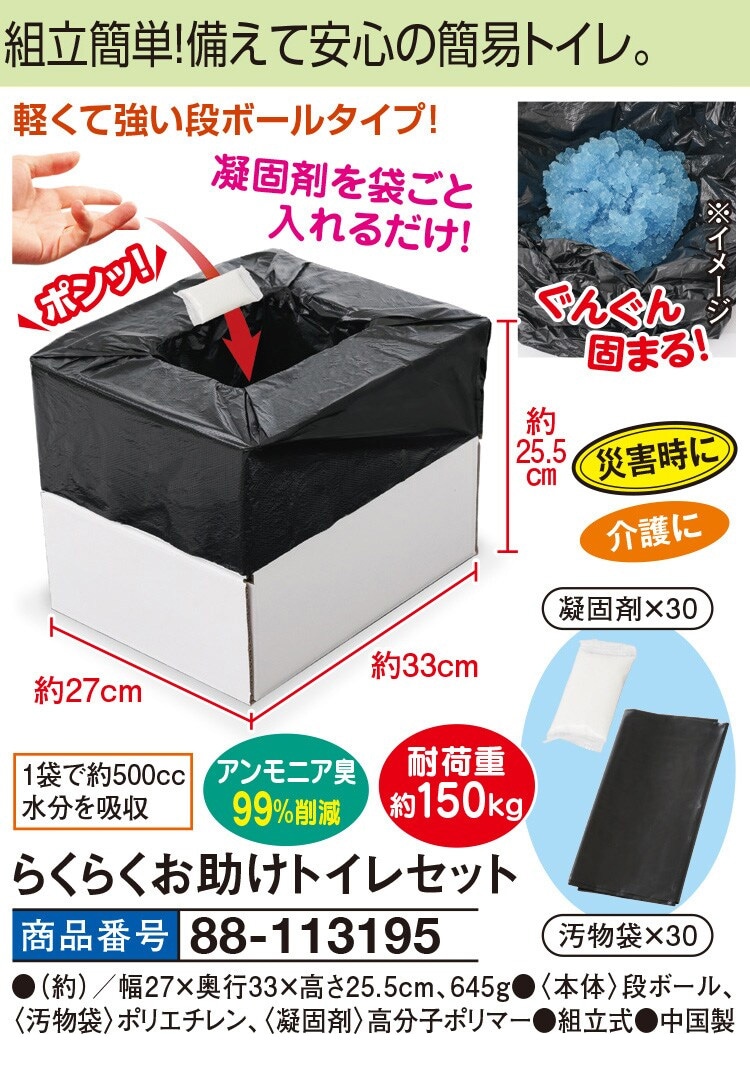 組立簡単!備えて安心の簡易トイレ! 軽くて強い段ボールタイプ! \ポンッ!/ 凝固剤を袋ごと入れるだけ! ぐんぐん固まる! 1袋で約500cc水分を吸収 ●アンモニア臭99%削減 ●耐荷重約150kg ●災害時に ●介護に ・凝固剤×30・汚物袋×30