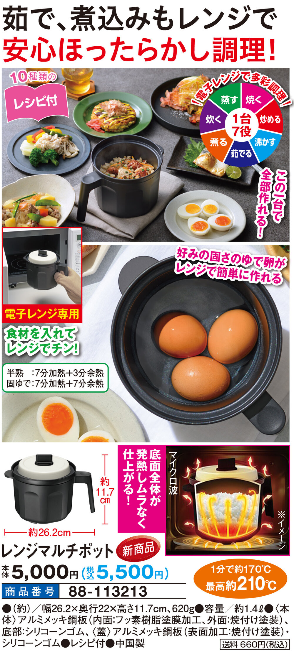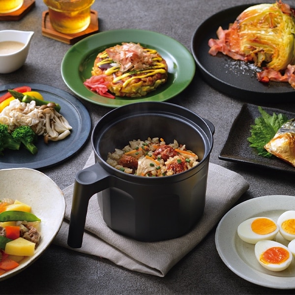 茹で、煮込みもレンジで安心ほったらかし調理! 好みの固さのゆで卵がレンジで簡単に作れる 半熟:7分加熱+3分余熱 固ゆで:7分加熱+7分余熱 ●食材を入れてレンジでチン! ●電子レンジ専用 ●10種類のレシピ付 【電子レンジで多彩調理】 この一台で全部作れる! 1台7役 ・焼く ・炒める ・沸かす ・茹でる ・煮る ・炊く ・蒸す 底面全体が発熱しムラなく仕上がる! 1分で約170度、最高約210度