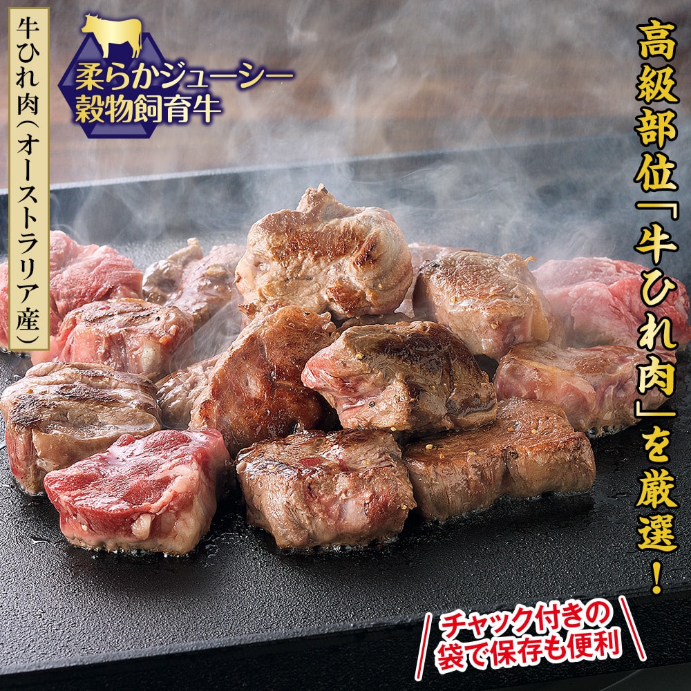 【牛ひれ肉(オーストラリア産)】 柔らかジューシー穀物飼育牛。 60日間じっくり熟成させ旨味をぎゅっと閉じ込めた逸品。 丁寧にスジ切りしているので柔らかく食べやすい一口ステーキです。 チャック付きの袋で保存も便利。
