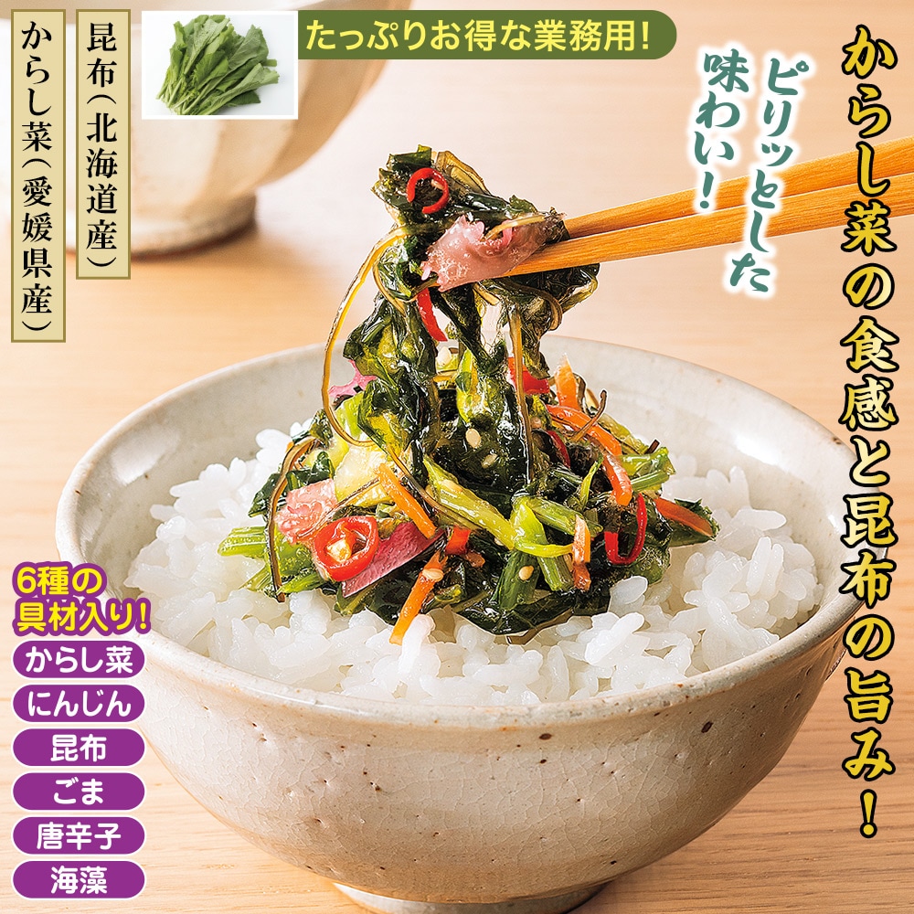 【昆布(北海道産)】【からし菜(愛媛県産)】 たっぷりお得な業務用!ピリッとした味わい! 良質な「愛媛特産からし菜」と「北海道昆布」を合わせました。 あと引く昆布の旨みとピリッとした味わいが特徴です。 6種の具材入り! からし菜・にんじん・昆布・ごま・唐辛子・海藻