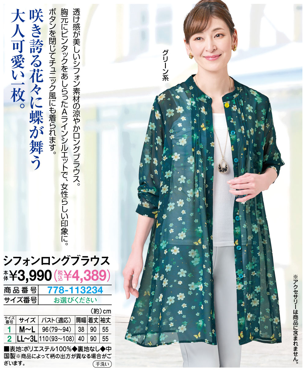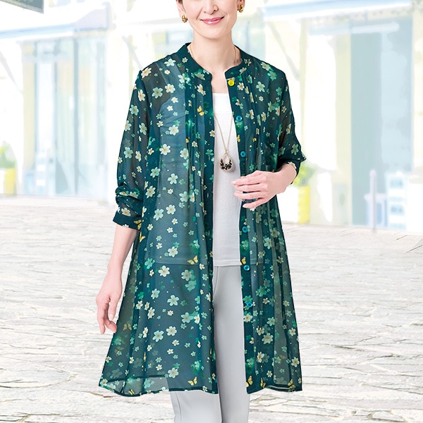 咲き誇る花々に蝶が舞う大人可愛い一枚! 透け感が美しいシフォン素材の涼やかロングブラウス。胸元にピンタックをあしらったAラインシルエットで、女性らしい印象に。ボタンを閉じてチュニック風にも着られます。
