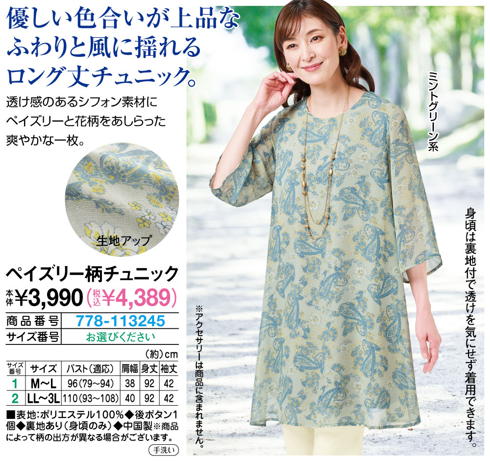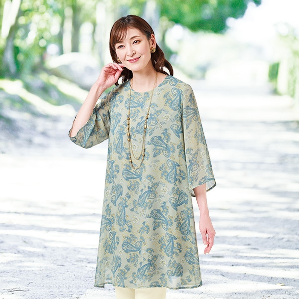 優しい色合いが上品なふわりと風に揺れるロング丈チュニック! 透け感のあるシフォン素材にペイズリーと花柄をあしらった爽やかな一枚。 身頃は裏地付で透けを気にせず着用できます。