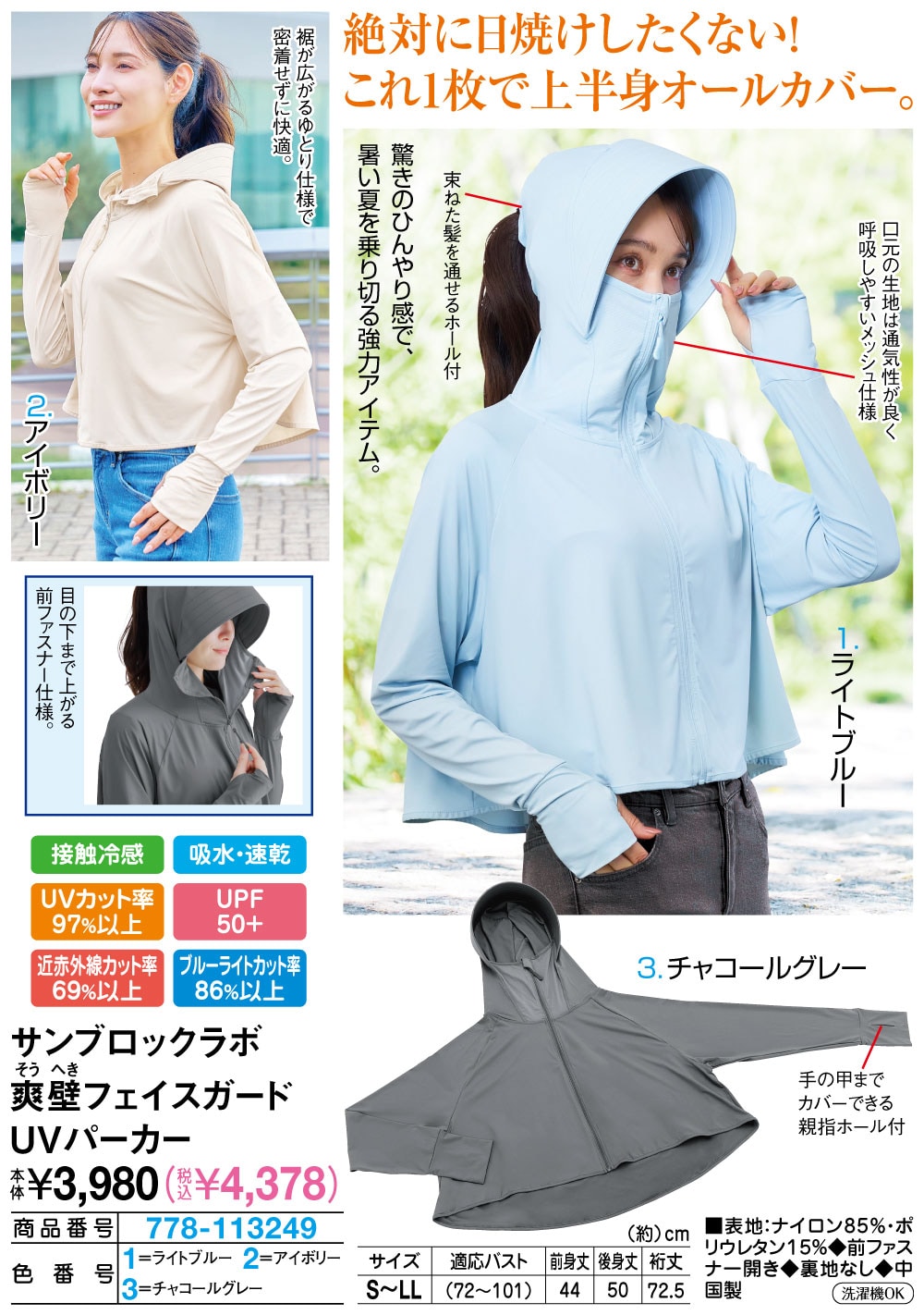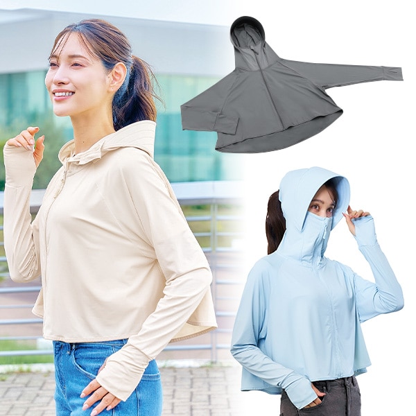 絶対に日焼けしたくない!これ1枚で上半身オールカバー! 驚きのひんやり感で、暑い夏を乗り切る強力アイテム。 口元の生地は通気性が良く呼吸しやすいメッシュ仕様 束ねた髪を通せるホール付 裾が広がるゆとり仕様で密着せずに快適。 目の下まで上がる前ファスナー仕様。 手の甲までカバーできる親指ホール付 ●接触冷感 ●吸水・速乾 ●UVカット率97%以上 ●UPF50+ ●近赤外線カット率69%以上 ●ブルーライトカット率86%以