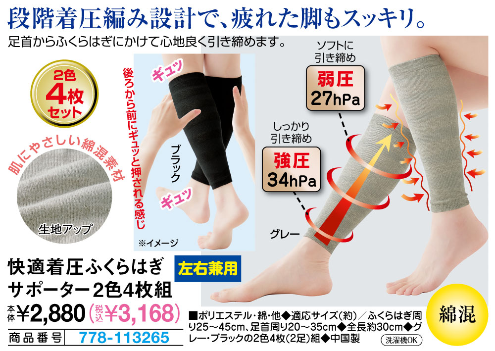 段階着圧編み設計で、疲れた脚もスッキリ! 足首からふくらはぎにかけて心地良く引き締めます。 後ろから前にギュッと押される感じ 肌にやさしい綿混素材 ●2色4枚セット ●左右兼用 ●綿混 【ソフトに引き締め】弱圧27hPa 【しっかり引き締め】強圧34hPa