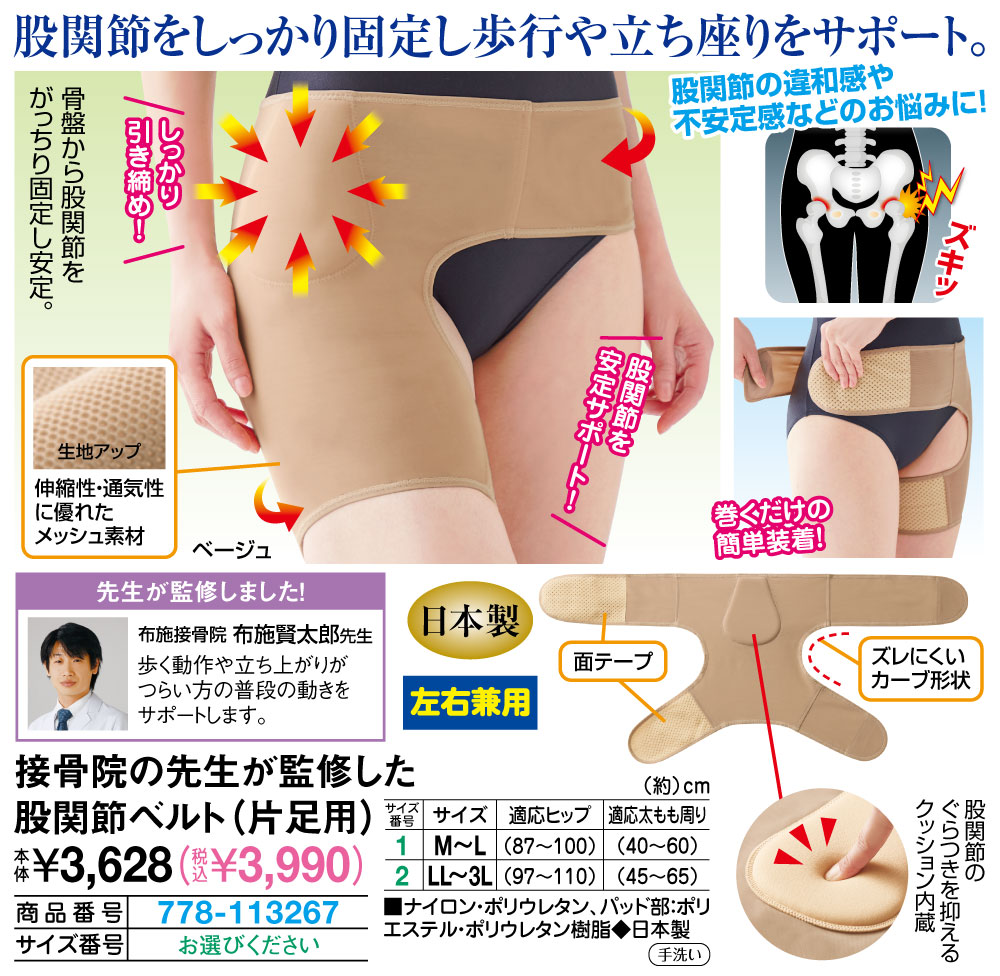 股関節をしっかり固定し歩行や立ち座りをサポート! 骨盤から股関節をがっちり固定し安定。 股関節の違和感や不安定感などのお悩みに! しっかり引き締め! 股関節を安定サポート! 巻くだけの簡単装着! 股関節のぐらつきを抑えるクッション内蔵 【先生が監修しました! 】 布施接骨院 布施賢太郎先生 歩く動作や立ち上がりがつらい方の普段の動きをサポートします。 ●面テープ ●ズレにくいカーブ形状 ●左右兼用