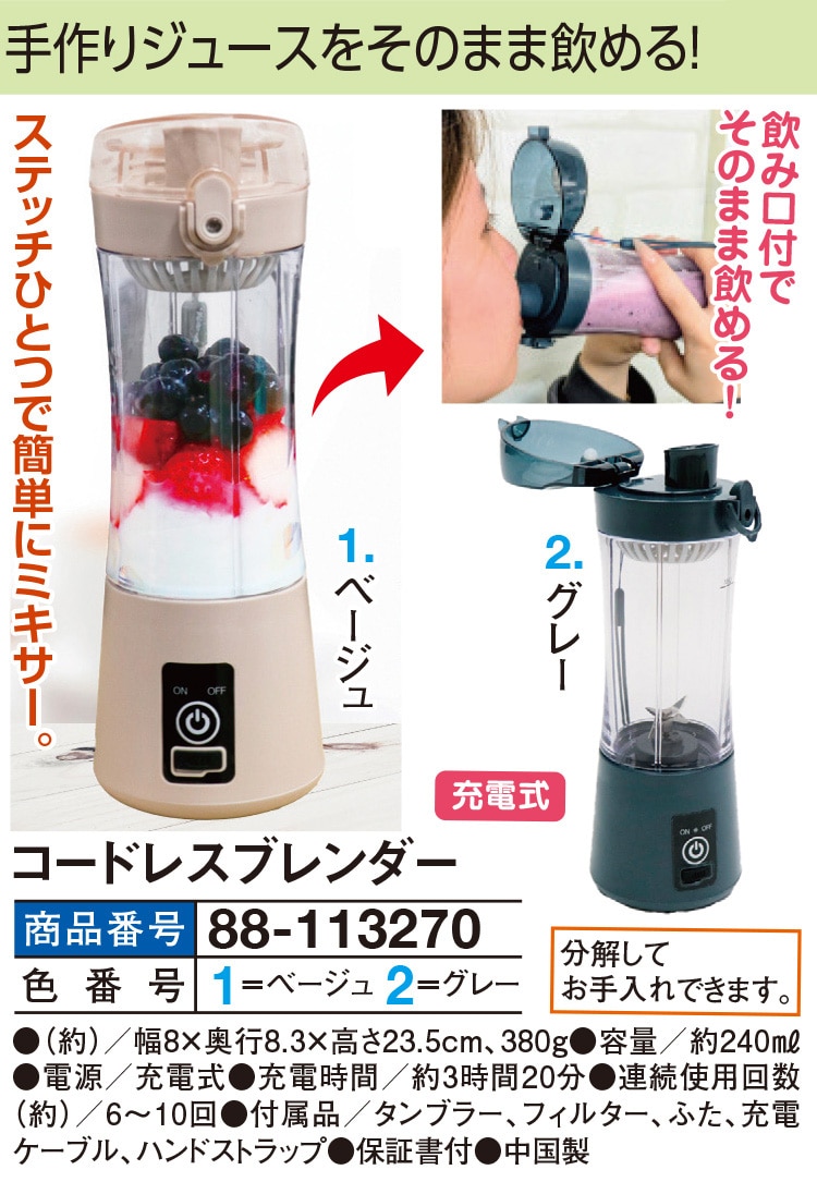 手作りジュースをそのまま飲める! 飲み口付でそのまま飲める! ステッチひとつで簡単にミキサー。 分解してお手入れできます。 ●充電式