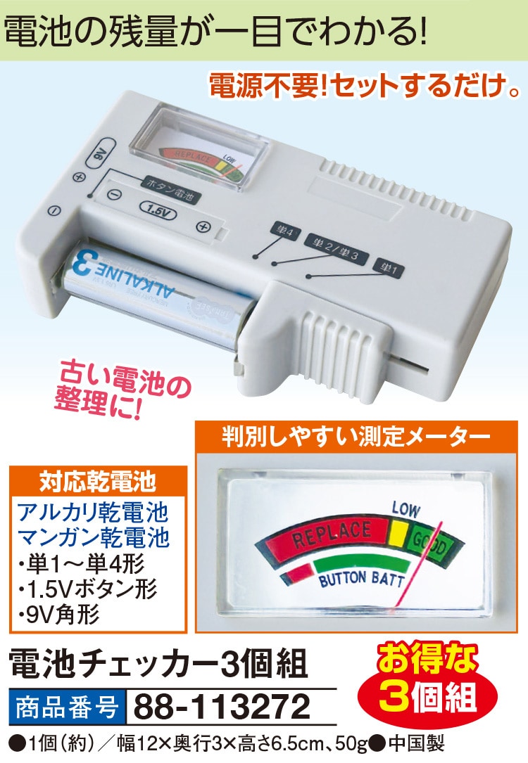 電池の残量が一目でわかる! 電源不要!セットするだけ。 古い電池の整理に! 判別しやすい測定メーター お得な3個組 【対応乾電池】 アルカリ乾電池 マンガン乾電池 ・単1~単4形 ・1.5Vボタン形 ・9V角形