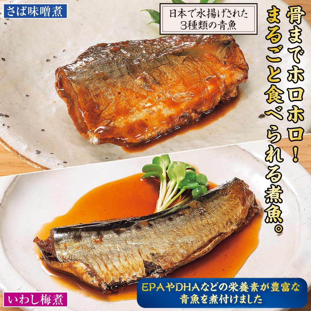 骨までほろほろ。丸ごと食べられる煮魚。 常温保存できて場所を取らない。 日本で水揚げされた3種の青魚。 EPAやDHAなどの栄養素が豊富な青魚を煮付けにしました。