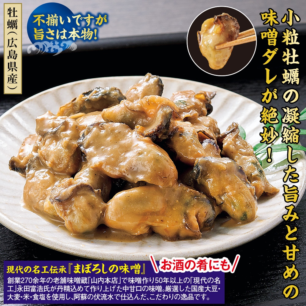 【牡蠣(広島県産)】 不揃いですが旨さは本物! 老舗味噌蔵「山内本店」の『まぼろしの味噌』と、熊本の伝統酒『東肥赤酒』を使用した味噌ダレで仕上げた逸品です。 ■現代の名工伝承『まぼろしの味噌』 創業270余年の老舗味噌蔵「山内本店」で味噌作り50年以上の「現代の名工」永田富浩氏が丹精込めて作り上げた中甘口の味噌。厳選した国産大豆・大麦・米・食塩を使用し、阿蘇の伏流水で仕込んだ、こだわりの逸品です。