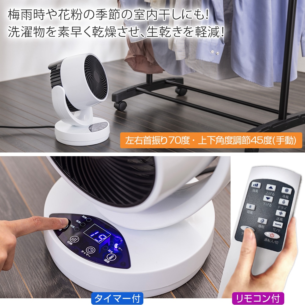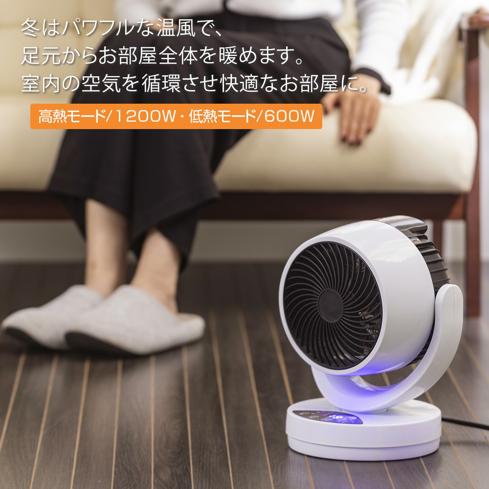 高熱モード(1200W)は、約28~40℃のパワフルな温風で足元からお部屋全体を暖めます。低熱モード(600W)も搭載。 冷風モード(35W)は、サーキュレーターとして室内の空気を効率よく循環させ、エアコンと併用することで省エネにも貢献。 高熱モードのパワフルな温風は、ジメジメした梅雨時や花粉の季節の室内干しにも最適。洗濯物を素早く乾燥させ、生乾きの不快感を解消します。 広範囲に風を送り出す自動左右首振り機能は約70度。 上下の角度調整も手動で約45度まで可能です。 ◎コンパクトな大きさでで、置き場所を選びません。 ◎重さも約1.49kgと軽量なので、持ち運びも楽々です。