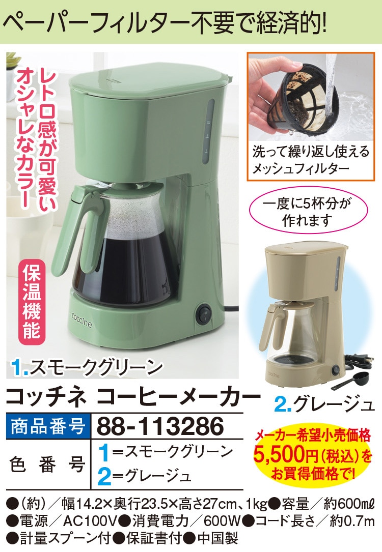 ペーパーフィルター不要で経済的! レトロ感が可愛いオシャレなカラー 洗って繰り返し使えるメッシュフィルター 一度に5杯分が作れます ●保温機能