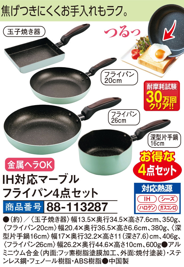 焦げつきにくくお手入れもラク! 【お得な4点セット】 玉子焼き器 フライパン20cm フライパン26cm 深型片手鍋16cm 金属ヘラOK 耐摩耗試験30万回クリア! 【対応熱源】 ・IH ・シーズ ・ハロゲン ・ガスコンロ