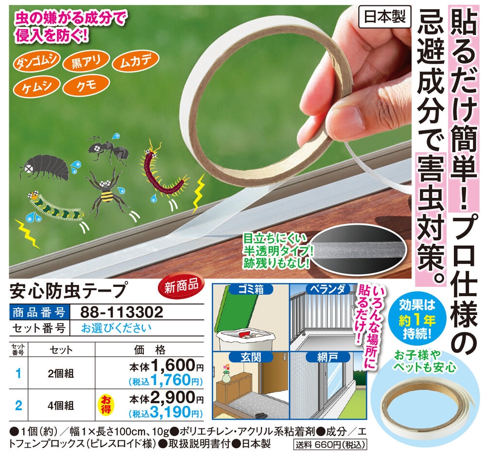 貼るだけ簡単!プロ仕様の忌避成分で害虫対策! \大切な家や畑・作物を守る/ 害獣・害鳥対策おすすめグッズ 令和6年度の農作物被害による被害額約188億円※農林水産省発表 虫の嫌がる成分で侵入を防ぐ! ・ダンゴムシ ・黒アリ ・ムカデ ・ケムシ ・クモ \いろんな場所に貼るだけ!/ ●ゴミ箱 ●ベランダ ●玄関 ●網戸 効果は約1年持続! お子様やペットも安心 目立ちにくい半透明タイプ!跡残りもなし!