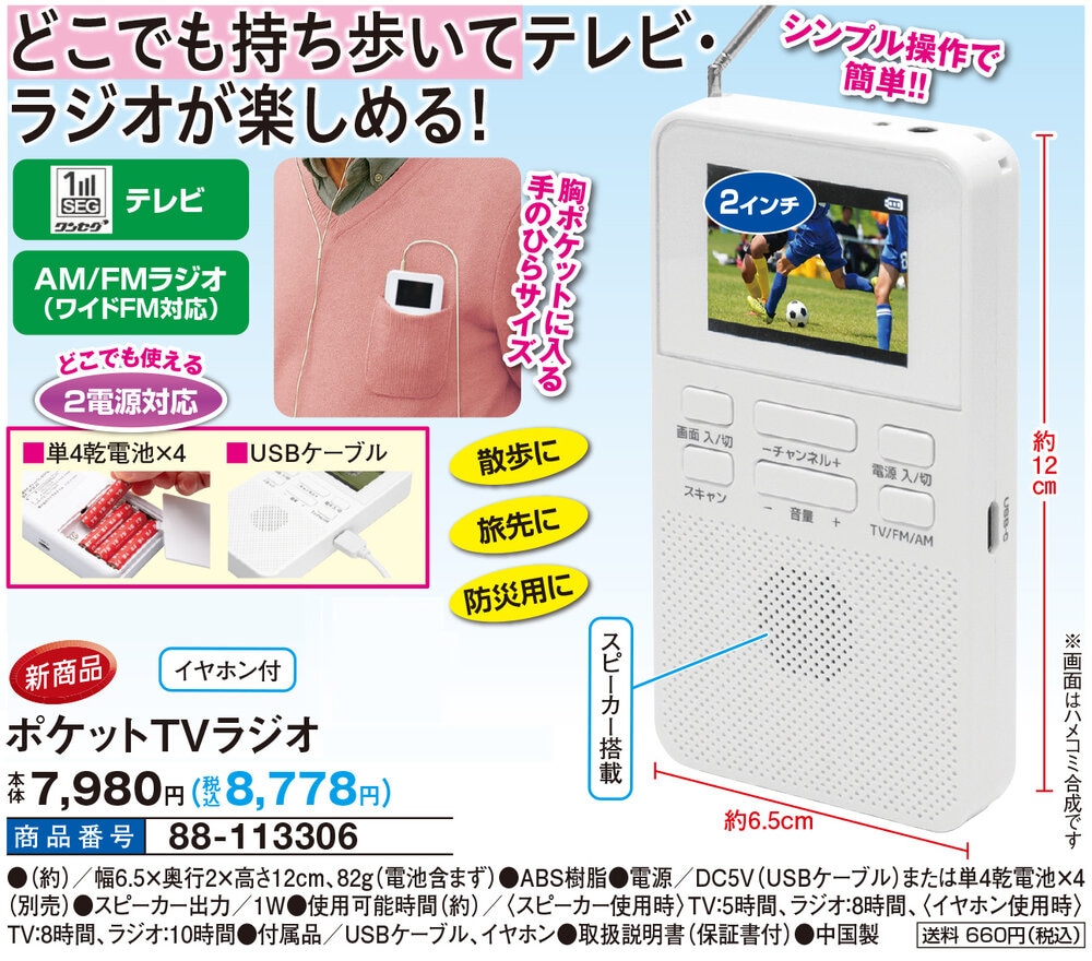 どこでも持ち歩いてテレビ・ラジオが楽しめる! シンプル操作で簡単!! 胸ポケットに入る手のひらサイズ ●テレビ(1seg ワンセグ) ●AM/FMラジオ(ワイドFM対応) ●2インチ ●スピーカー搭載 ●イヤホン付 \どこでも使える2電源対応/ ■単4乾電池×4 ■USBケーブル ●散歩に ●旅先に ●防災用に