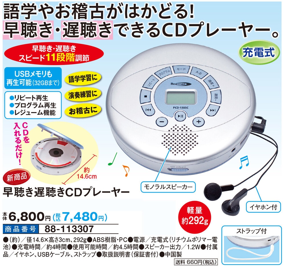 語学やお稽古がはかどる!早聴き・遅聴きできるCDプレーヤー! ●リピート再生 ●プログラム再生 ●レジューム機能 早聴き・遅聴きスピード11段階調節 語学学習に、演奏練習に、お稽古に USBメモリも再生可能(32GBまで) CDを入れるだけ! ●モノラルスピーカー ●軽量 ●充電式 ●イヤホン付 ●ストラップ付