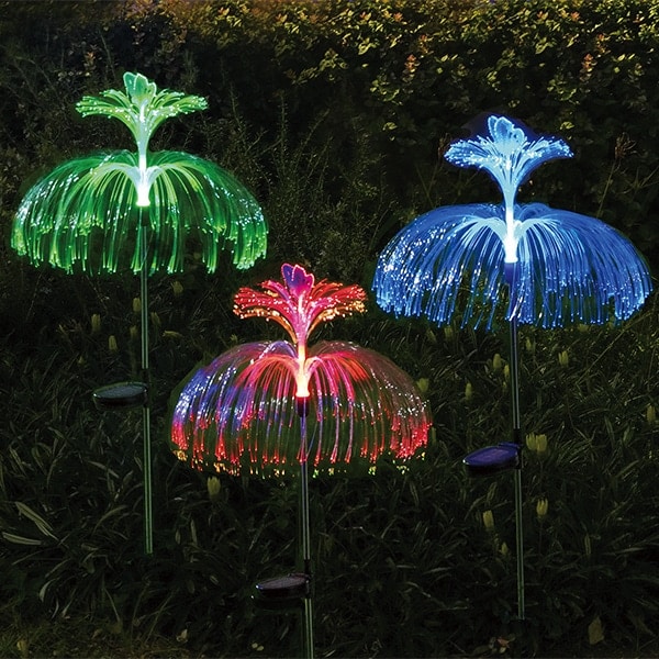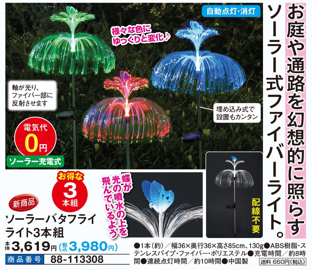 お庭や通路を幻想的に照らすソーラー式ファイバーライト! 様々な色にゆっくりと変化♪蝶が噴水の上を飛んでいるよう 軸が光り、ファイバー部に反射させます 埋め込み式で設置もカンタン ●お得な3本組 ●自動点灯・消灯 ●配線不要 ●電気代0円:ソーラー充電式
