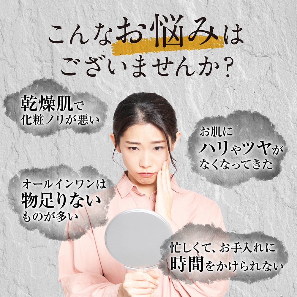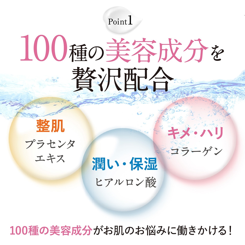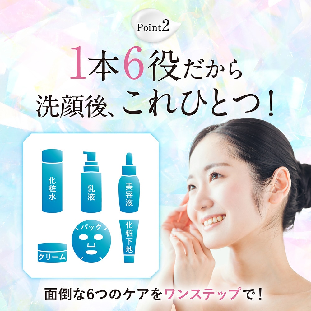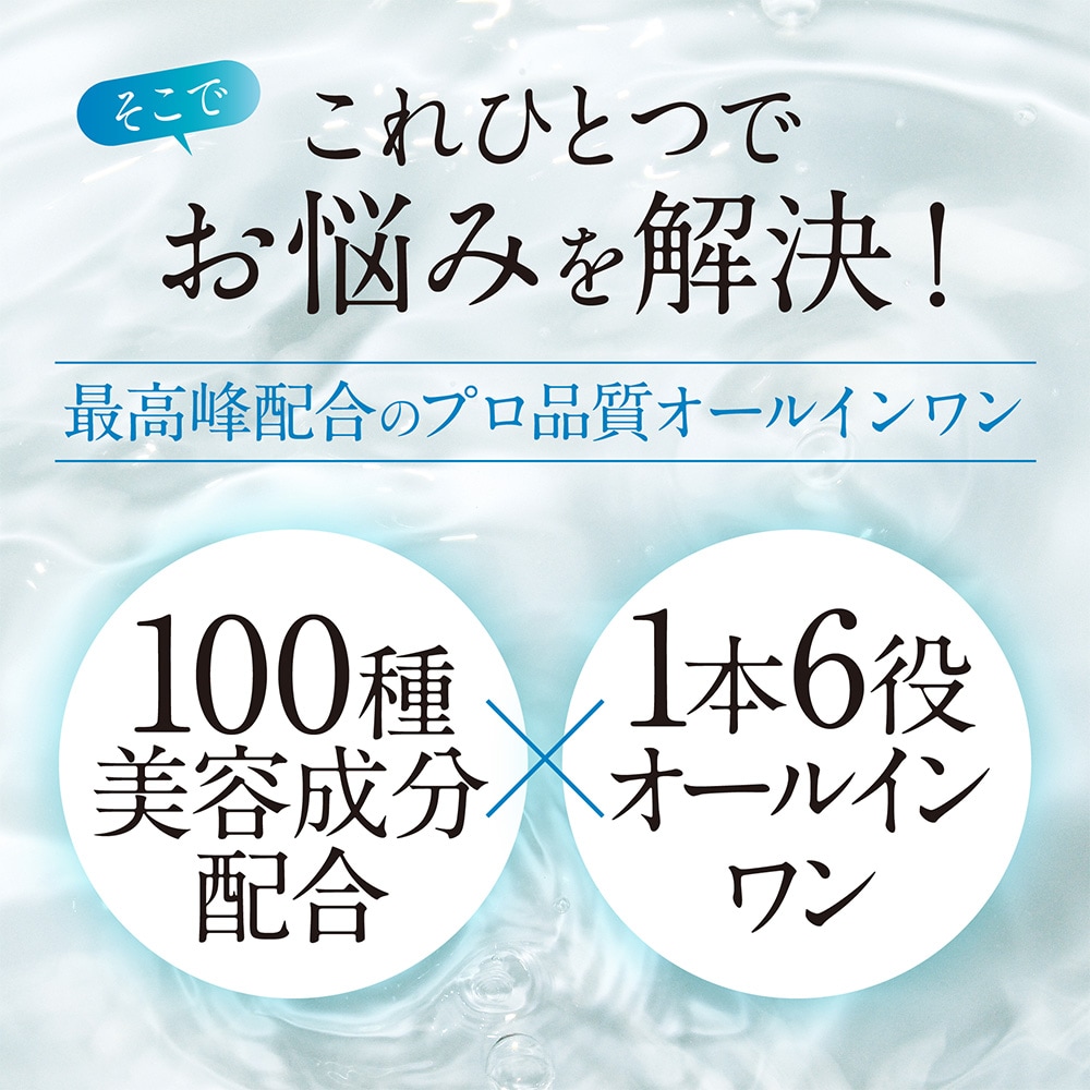 ◎高級エステでも使われる、プロの品質。 ワールドマッサージスーパーカップ2023で世界3位を受賞したトップエステティシャン・舟津真里氏が開発。 ご本人のサロンでも、コースの仕上げに使用されているオールインワンアイテムです。 ◎100種の美容成分で、年齢肌にうるおいを。 ヒアルロン酸、コラーゲン、プラセンタなど、厳選された100種類の美容成分を配合。 乾燥しやすい角質層までなじみ、これ1本で、しっとり感が続きます。 ◎1本6役。ベタつかないから、朝のメイク前にも。 化粧水から下地まで、ワンプッシュでお手入れ完了。 ベタつきにくく、肌になじみやすい使い心地なので、忙しい朝にもさっと使えます。 便利なポンプ式で、最後まで衛生的にお使いいただけます。 <効果的な使い方> 洗顔後、軽くマッサージする様に下から上に優しくなじませ、そのまま首までのばします。 乾燥しやすい目元やおでこにたっぷりつけるのがオススメです。