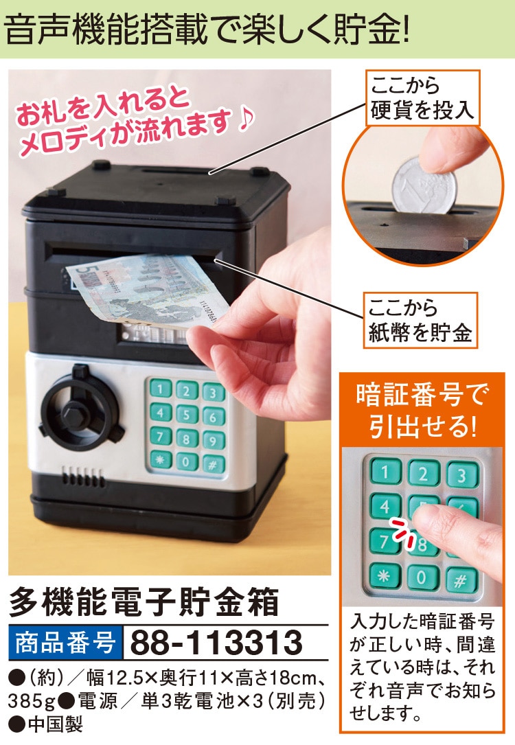 音声機能搭載で楽しく貯金! お札を入れるとメロディが流れます♪ ここから硬貨を投入 ここから紙幣を貯金 暗証番号で引出せる! 入力した暗証番号が正しい時、間違えている時は、それぞれ音声でお知らせします。