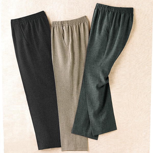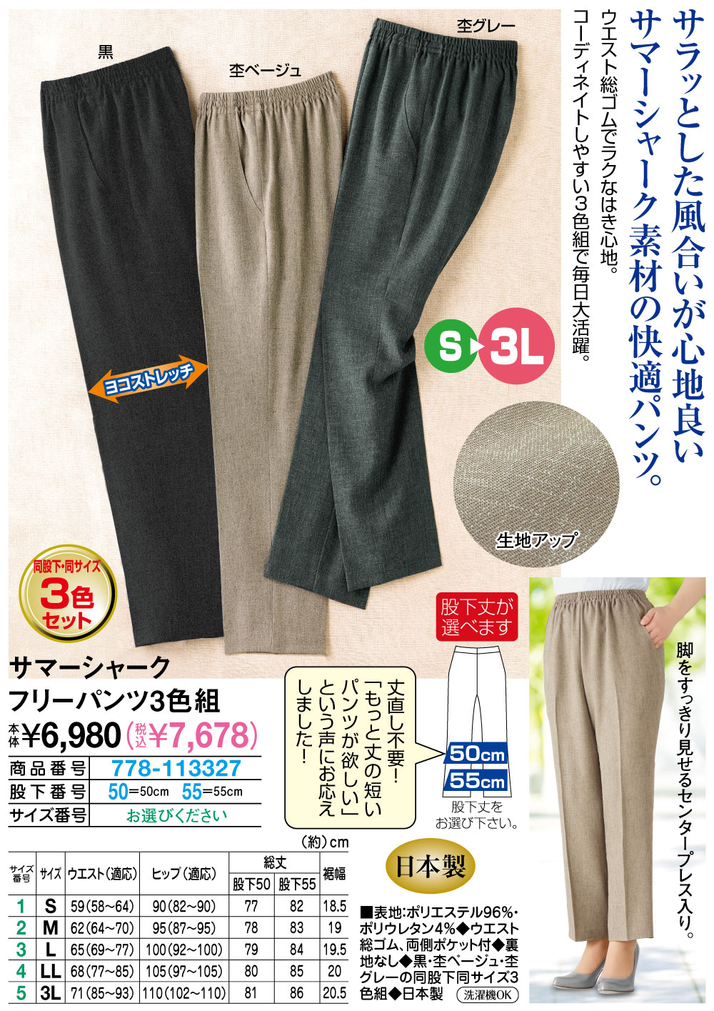 股下50cm【サイズ(約)】 ウエスト(適応)、ヒップ(適応)、総丈、裾幅 <S>59(58~64)cm、90(82~90)cm、77cm、18.5cm <M>62(64~70)cm、95(87~95)cm、78cm、19cm <L>65(69~77)cm、100(92~100)cm、79cm、19.5cm <LL>68(77~85)cm、105(97~105)cm、80cm、20cm <3L>71(85~93)cm、110(102~110)cm、81cm、20.5cm 股下55cm【サイズ(約)】 ウエスト(適応)、ヒップ(適応)、総丈、裾幅 <S>59(58~64)cm、90(82~90)cm、82cm、18.5cm <M>62(64~70)cm、95(87~95)cm、83cm、19cm <L>65(69~77)cm、100(92~100)cm、84cm、19.5cm <LL>68(77~85)cm、105(97~105)cm、85cm、20cm <3L>71(85~93)cm、110(102~110)cm、86cm、20.5cm ■表地:ポリエステル96%・ポリウレタン4% ◆ウエスト総ゴム、両側ポケット付 ◆裏地なし ◆黒・杢ベージュ・杢グレーの同股下同サイズ3色組 ◆日本製