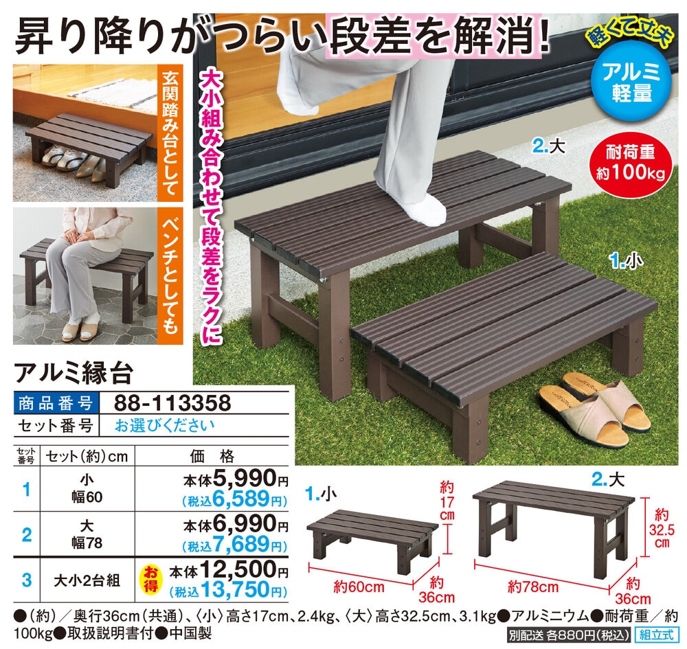 昇り降りがつらい段差を解消! 大小組み合わせて段差をラクに 玄関踏み台として ベンチとしても ●軽くて丈夫!アルミ軽量
