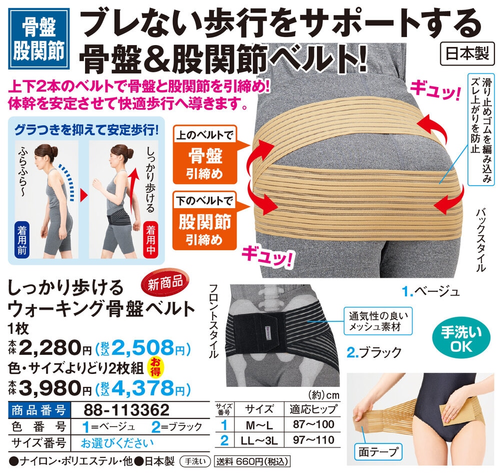 ブレない歩行をサポートする骨盤&股関節ベルト! 【グラつきを抑えて安定歩行!】 着用前:ふらふら~ 着用中:しっかり歩ける 上下2本のベルトで骨盤と股関節を引締め! 体幹を安定させて快適歩行へ導きます。 上のベルトで骨盤引締め 下のベルトで股関節引締め 滑り止めゴムを編み込みズレ上がりを防止 ・通気性の良いメッシュ素材 ・面テープ