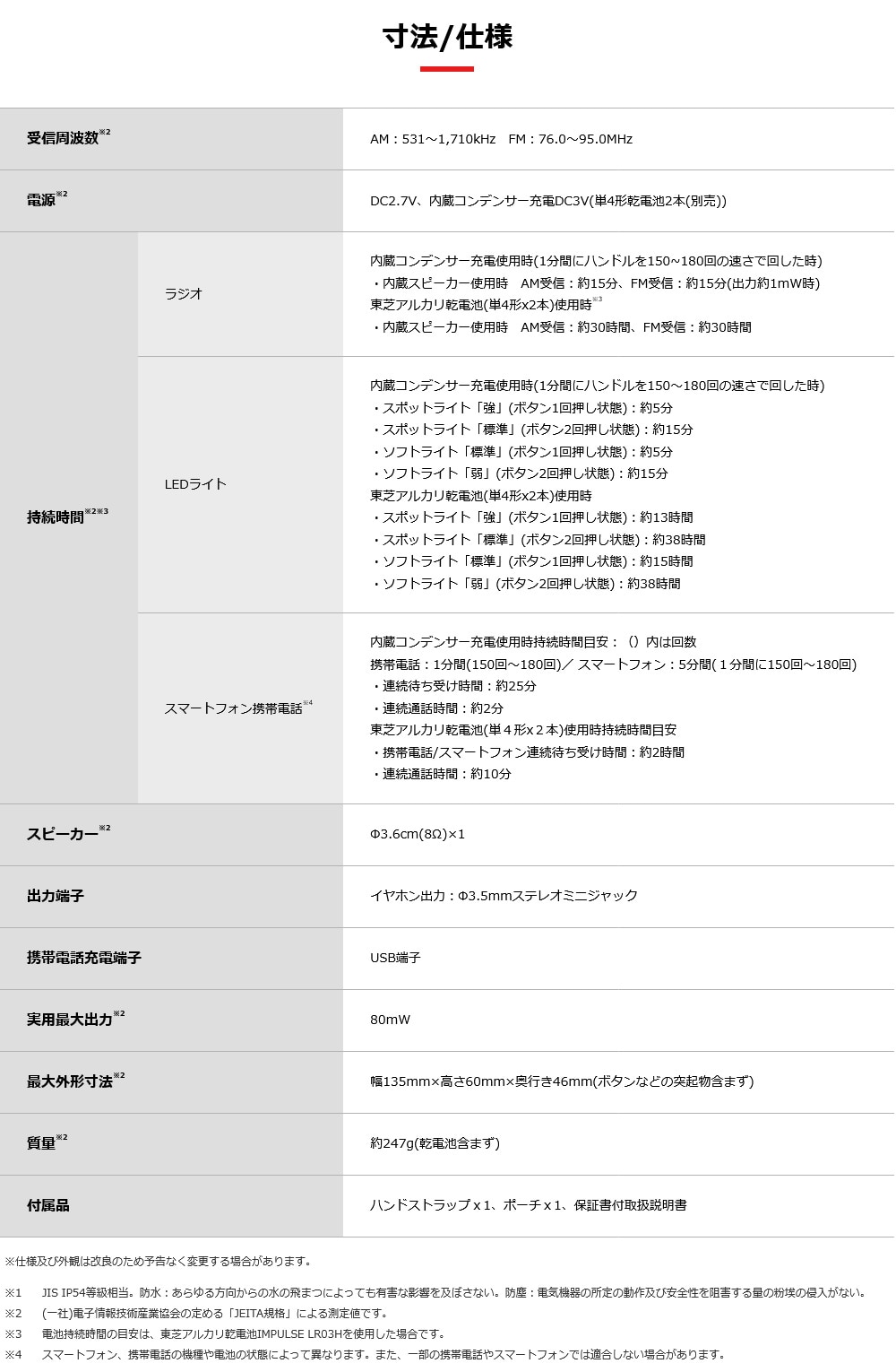 【受信周波数】AM:531~1,710kHz FM:76.0~95.0MHz 【電源】DC2.7V、内蔵コンデンサー充電DC3V(単4形乾電池2本(別売)) 【スピーカー】Φ3.6cm(8Ω)×1 【出力端子】イヤホン出力:Φ3.5mmステレオミニジャック 【携帯電話充電端子】USB端子 【実用最大出力】80mW 【最大外形寸法(約)】幅135×高さ60×奥行き46mm(ボタンなどの突起物含まず) 【質量(約)】247g(乾電池含まず) 【付属品】ハンドストラップx1、ポーチx1、保証書付取扱説明書