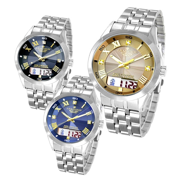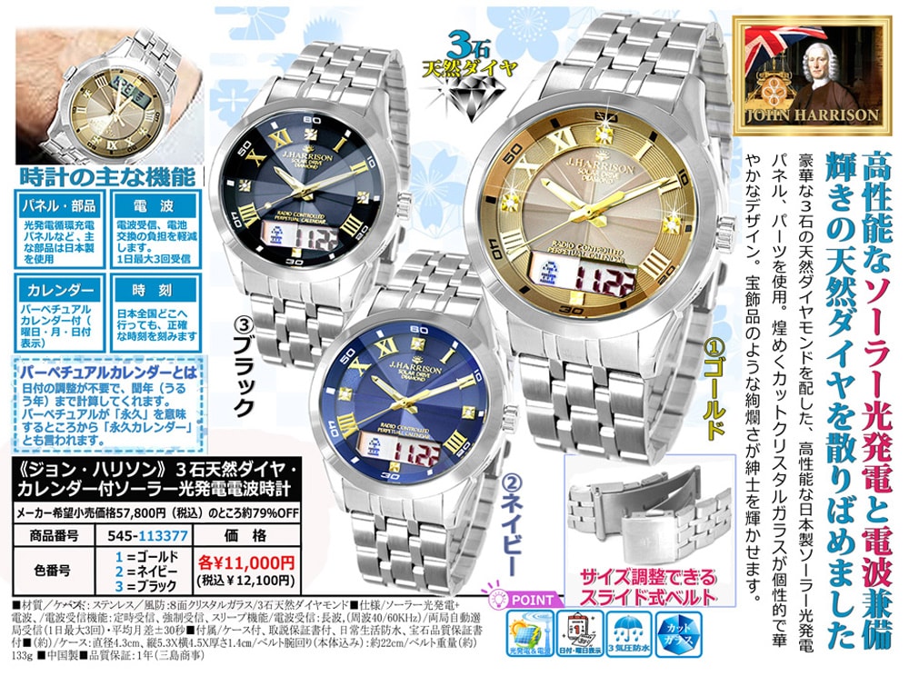 ジョン・ハリソン 3石天然ダイヤ・カレンダー付ソーラー光発電電波時計