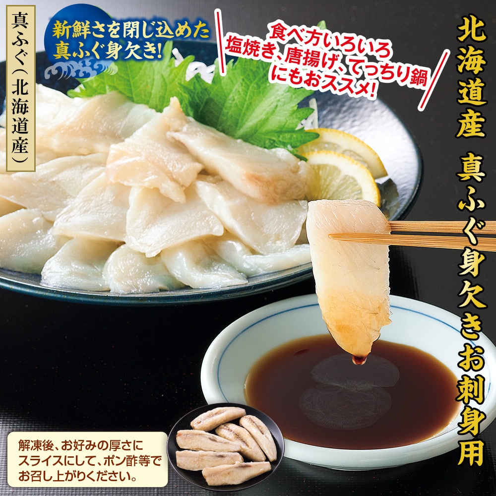 【真ふぐ(北海道産)】 新鮮さを閉じ込めた真ふぐ身欠き! 食べ方いろいろ塩焼き、唐揚げ、てっちり鍋にもおススメ! 深い旨みと甘みの国産真ふぐを身欠きでお届けします。 ふぐならではの食感と弾力をお楽しみください。 解凍後、お好みの厚さにスライスにして、ポン酢等でお召し上がりください。