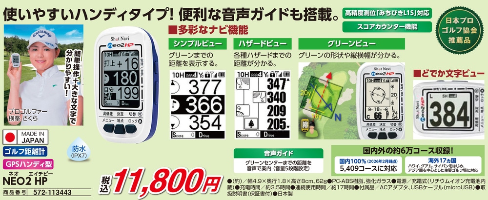 ●使いやすいハンディタイプ!便利な音声ガイドも搭載 ●簡単操作と「どでか文字ビュー」で情報をパッと確認 ●グリーンまでの距離、ハザード、グリーンの形状も丸わかり ●ボタンひとつでグリーンセンターまでの距離を音声で案内 ●高精度測位「みちびきL1S」対応でより正確な距離を表示 ●国内100%、海外の主要ゴルフ場を含む約6万コースを収録 ●日本プロゴルフ協会推薦品、信頼の日本製 ●スコアカウンター機能や防水仕様(IPX7)など役立つ機能が満載