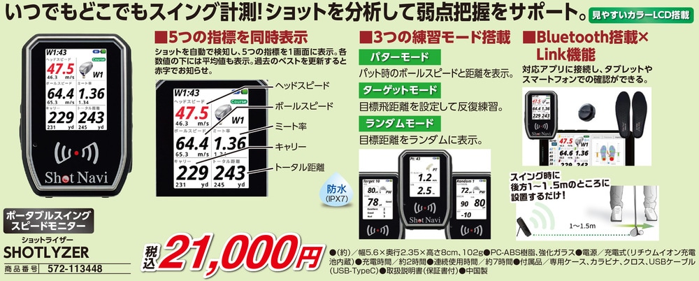 ●いつでもどこでもスイング計測!ショットを分析して弱点把握をサポート ●ショットを自動検知し、ヘッドスピードや飛距離など5つの指標を同時表示 ●見やすいカラーLCD搭載で、数値や過去のベスト更新も一目で確認 ●パター・ターゲット・ランダムの3つの練習モードで反復トレーニング ●Bluetooth搭載でスマホやタブレットのアプリと連携可能 ●スイング時に後方へ設置するだけの簡単セッティング ●持ち運びに便利なコンパクトサイズで、充電式だから電池交換不要 ●屋外の使用でも安心の防水仕様(IPX7)