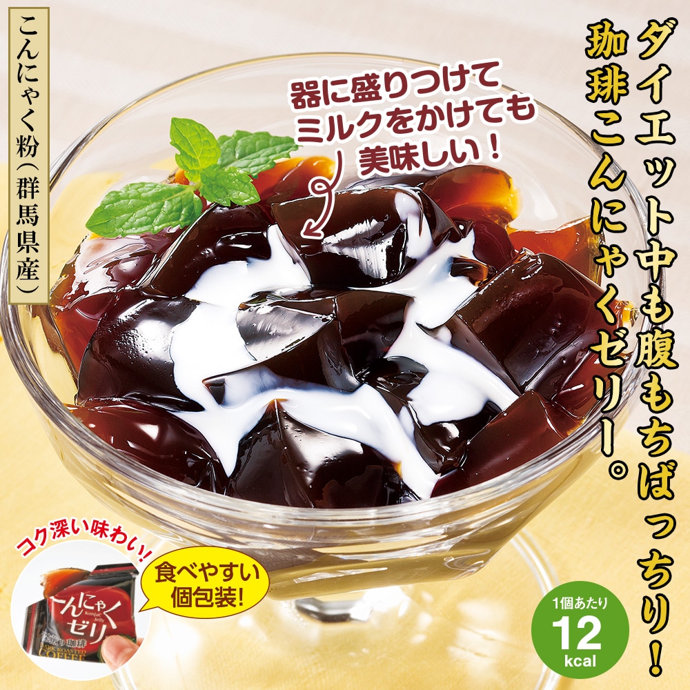 【こんにゃく粉(群馬県産)】 本格深煎り珈琲を使用したコク深い味わい。甘さがあって腹もちばっちり!ダイエット中のおやつにどうぞ! 器に盛りつけてミルクをかけても美味しい! コク深い味わい! 食べやすい個包装! 1個あたり12kcal