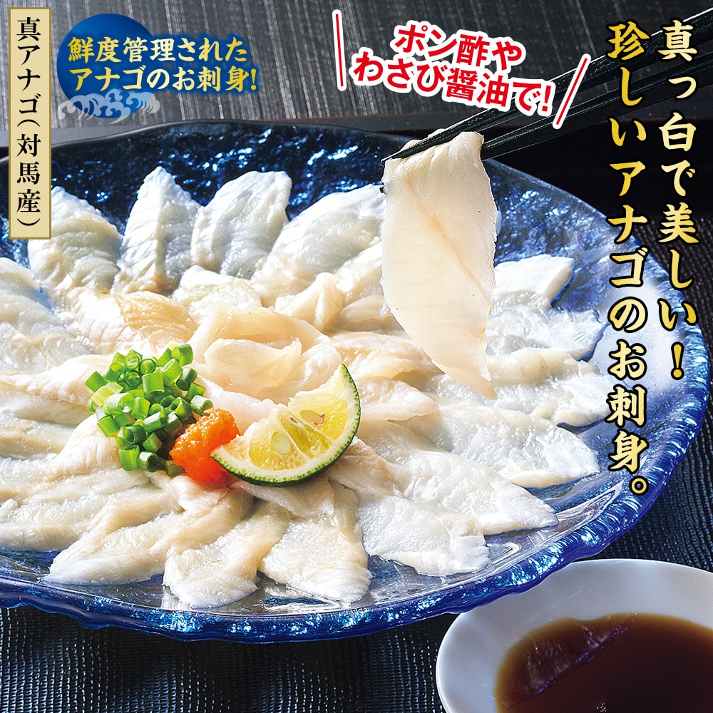 【真アナゴ(対馬産)】 鮮度管理されたアナゴのお刺身! ポン酢やわさび醤油で! 鮮度のいい状態を保ち、完璧に血抜きされたアナゴの身はこりこりとした歯ごたえです。 旨みと甘味がじわっと口の中に広がります。