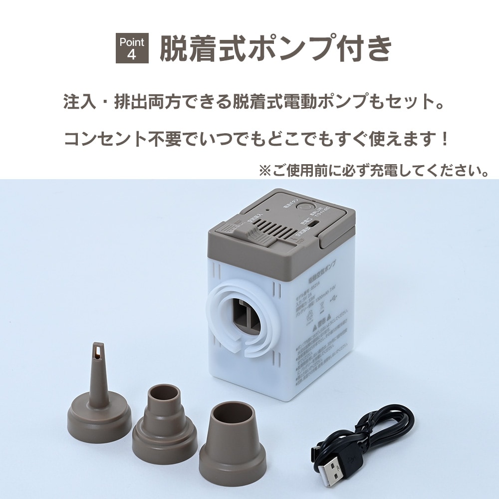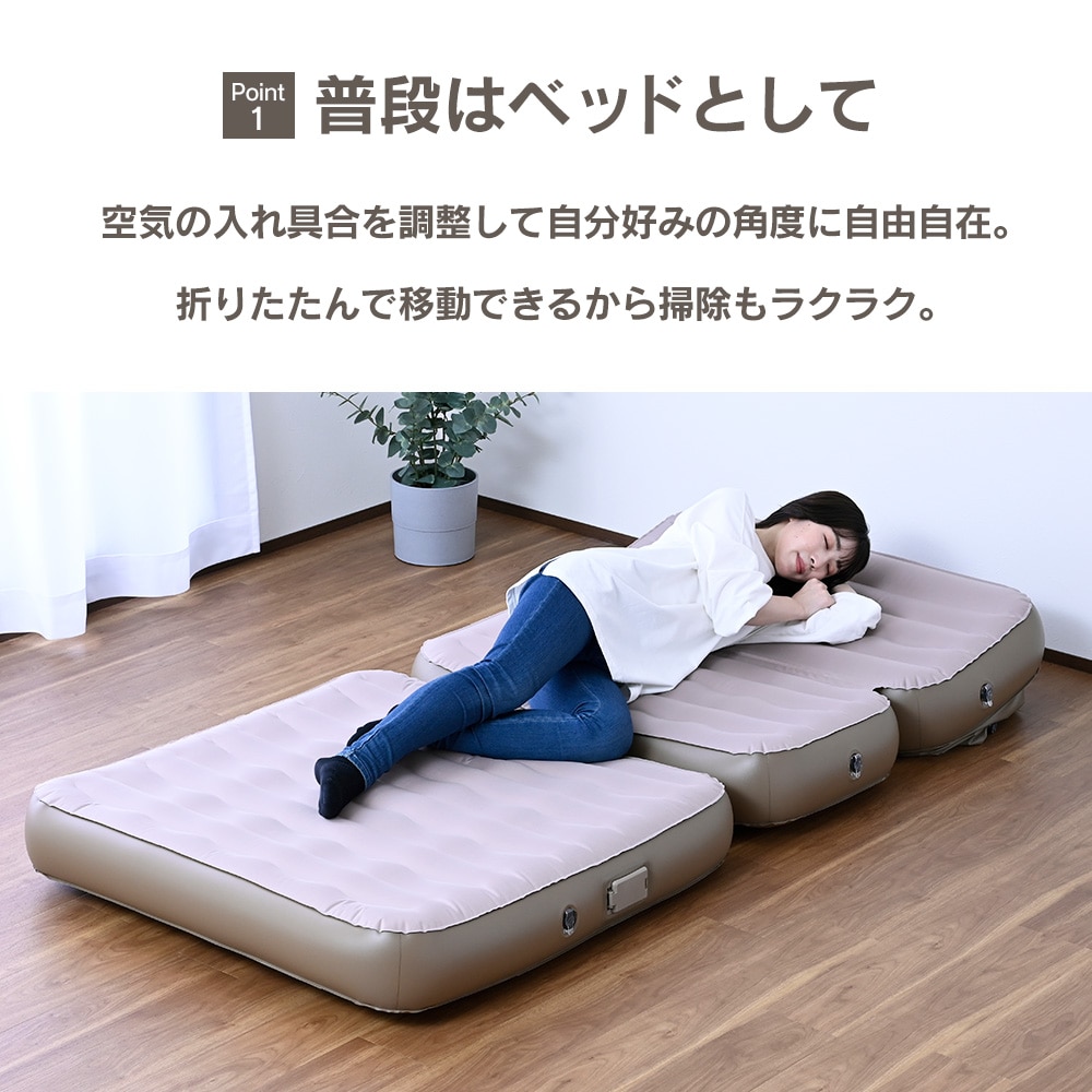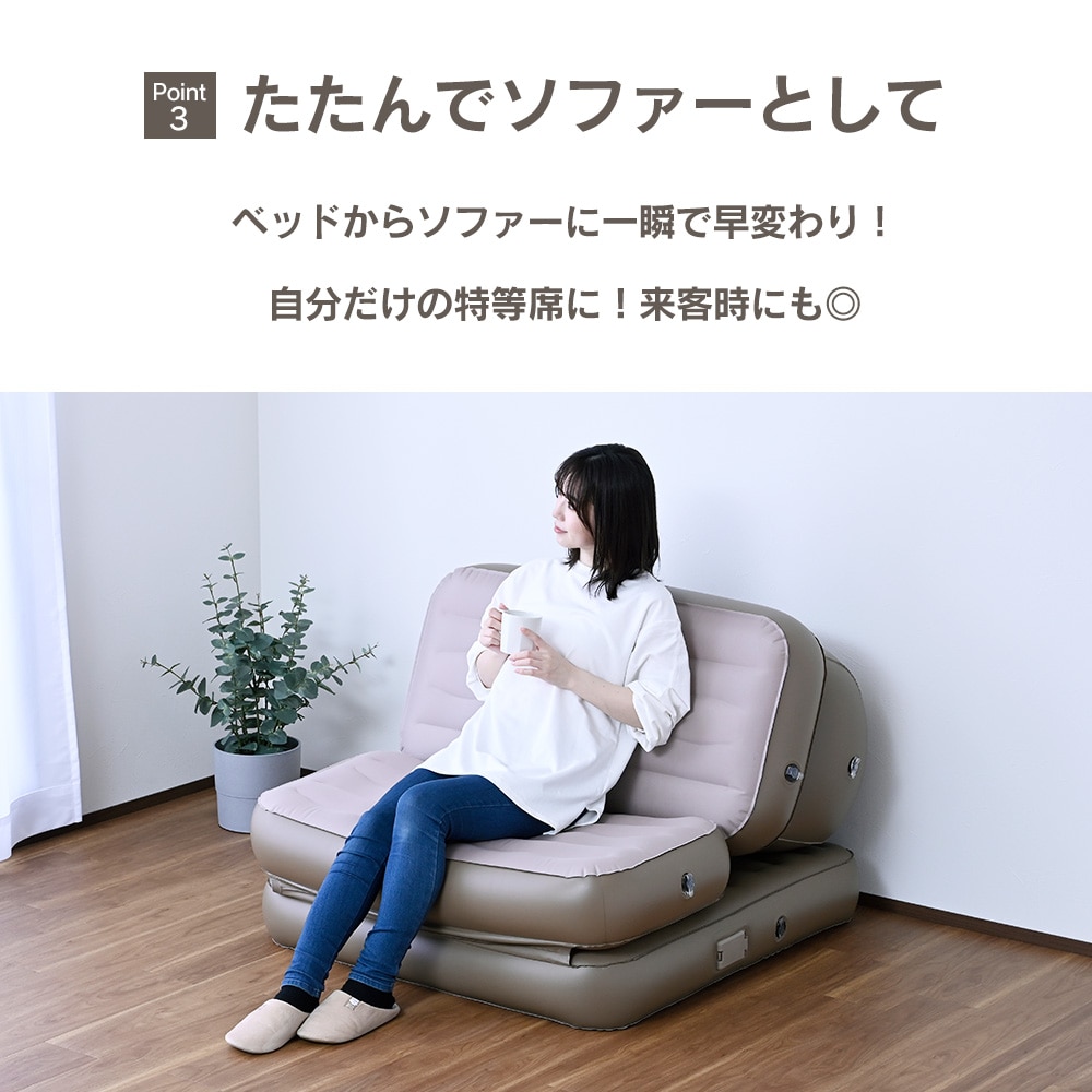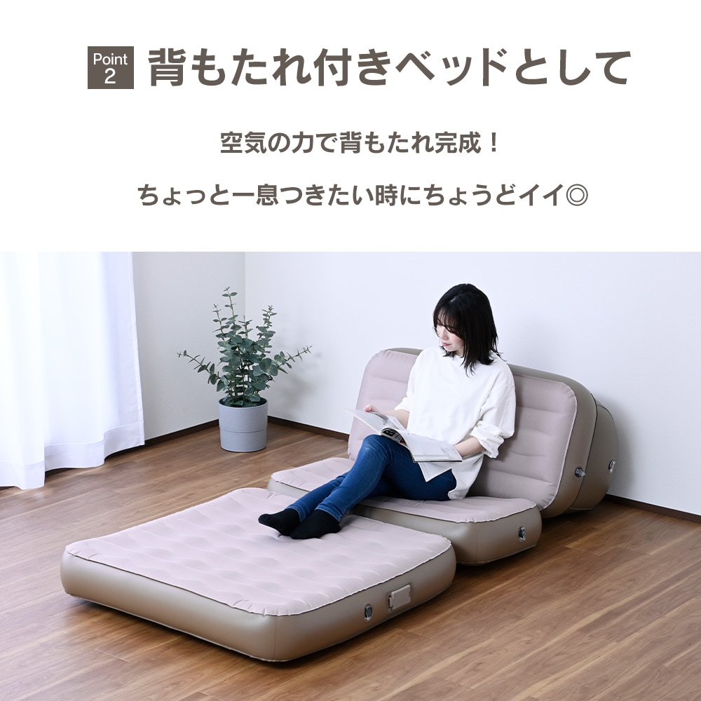 1台3役の脱着式ポンプ付き3wayエアーソファーベッド 空気の力で背もたれ完成。 空気の入れ具合を調整して自分好みの角度に自由自在。 通常のエアベッドとして、たたんでソファとして、背もたれ付きのベッドとしてご使用いただけます。 コンセントが無くてもOK! 脱着式ポンプ付きで いつでも何処でもすぐ使えます。 防災や急な来客に重宝します。 注入・排出両方できる脱着式電動ポンプ、ランタン付(明るさ2段階十点滅)