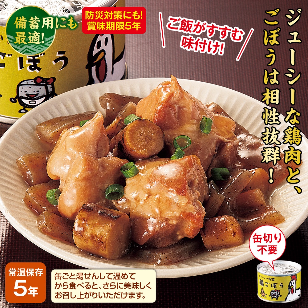 ご飯がすすむ味付け! 備蓄用にも最適! 缶ごと湯せんして温めてから食べると、さらに美味しくお召し上がりいただけます。 ぶつ切りにした鶏むね肉と、乱切りごぼうを特製のだしで煮込みました。素材の旨みと食感がたまらない缶詰です。 防災対策にも!賞味期限5年 缶切り不要