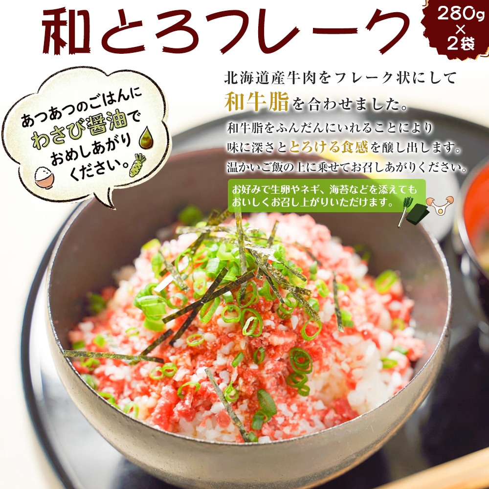 北海道産牛肉をフレーク状にして和牛脂を合わせました。 あつあつのごはんにわさび醤油でお召し上がりください。 和牛脂をふんだんにいれることにより味に深さととろける食感を醸し出します。 温かいご飯の上に乗せてお召しあがりください。 お好みで生卵やネギ、海苔などを添えてもおいしくお召し上がりいただけます。 ※「和トロフレーク」とは、昨今規制が厳しくなった牛肉のユッケやタタキなどの生食商材に変わる新しい食材として開発、生産されました。 本商品は、新技術で牛肉の生の食感や風味を損なわないように非加熱食肉製品加工をしています。 原材料は新鮮な北海道産国産牛を使用し、専用工場で衛生的に管理生産されていますので、袋から出してそのまま(冷凍状態)お召し上がりになれます(生肉ではなく生ハムの扱いとなります)。