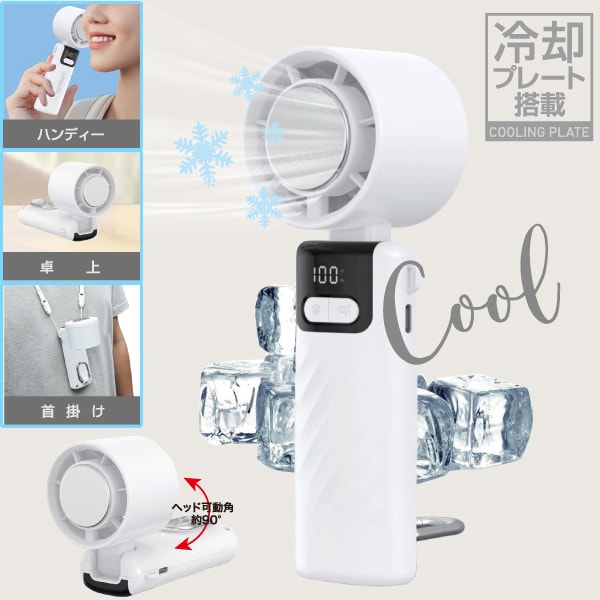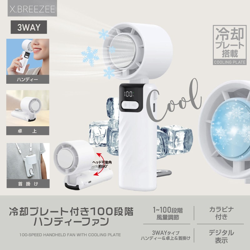 ◎選べる風量100段階! ◎冷却プレート付きで肌に当ててひんやりクールダウン ◎風量・冷却・電池残量が一目でわかるデジタル表示 ◎ハンディ、首掛け、卓上の3WAYで使えます!