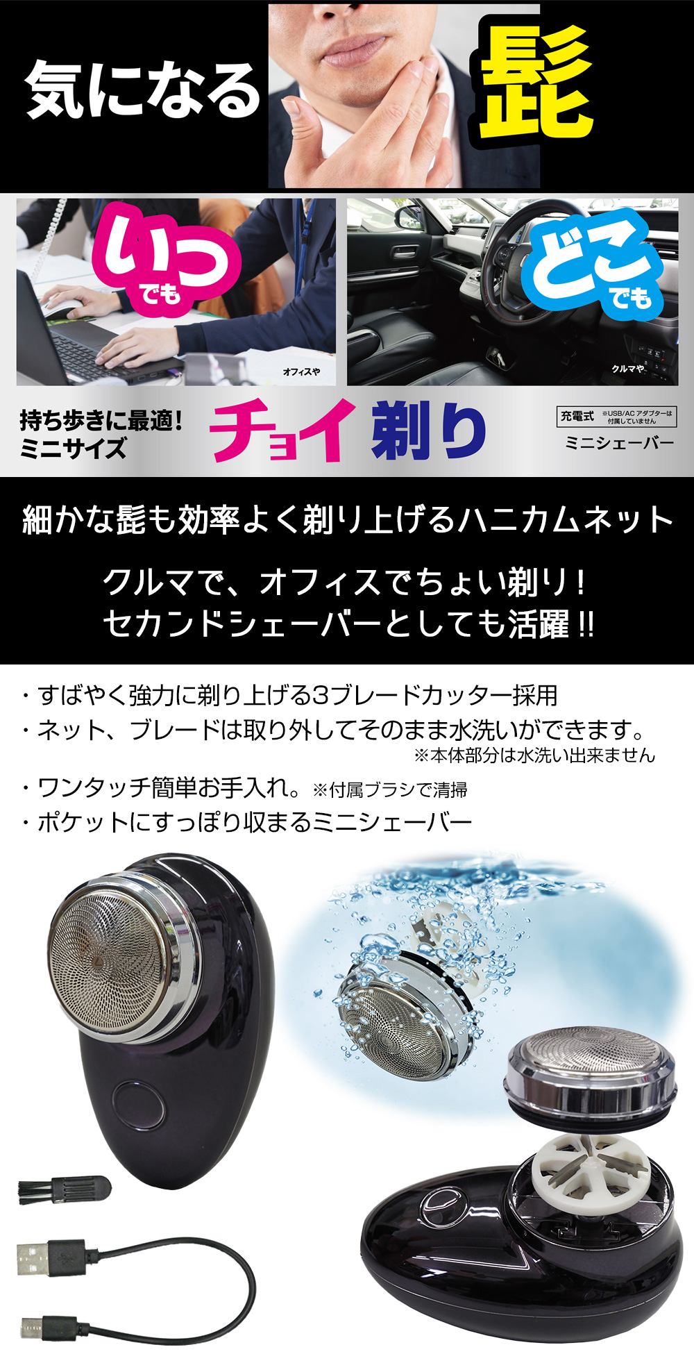 細かな髭も効率よく剃り上げるハニカムネット クルマで、オフィスでちょい剃り!セカンドシェーバーとしても活躍!! ◎すばやく強力に剃り上げる3ブレードカッター採用 ◎ネット、ブレードは取り外してそのまま水洗いができます。(※本体部分は水洗い出来ません。) ◎ワンタッチ簡単お手入れ。(※付属ブラシで清掃) ◎ポケットにすっぽり収まるミニシェーバー