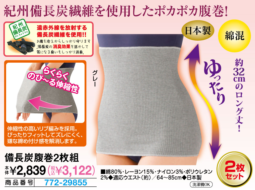 紀州備長炭繊維を使用したポカポカ腹巻! 約32cmのロング丈! 【遠赤外線を放射する備長炭繊維を使用!!】 お腹を冷えからしっかり守ります。備長炭の消臭効果を活かして気になる臭いもしっかり消臭。 【らくらくのび~る伸縮性】 伸縮性の高いリブ編みを採用。ぴったりフィットしてズレにくく、嫌な締め付け感を解消します。 ●綿混 ●2枚セット