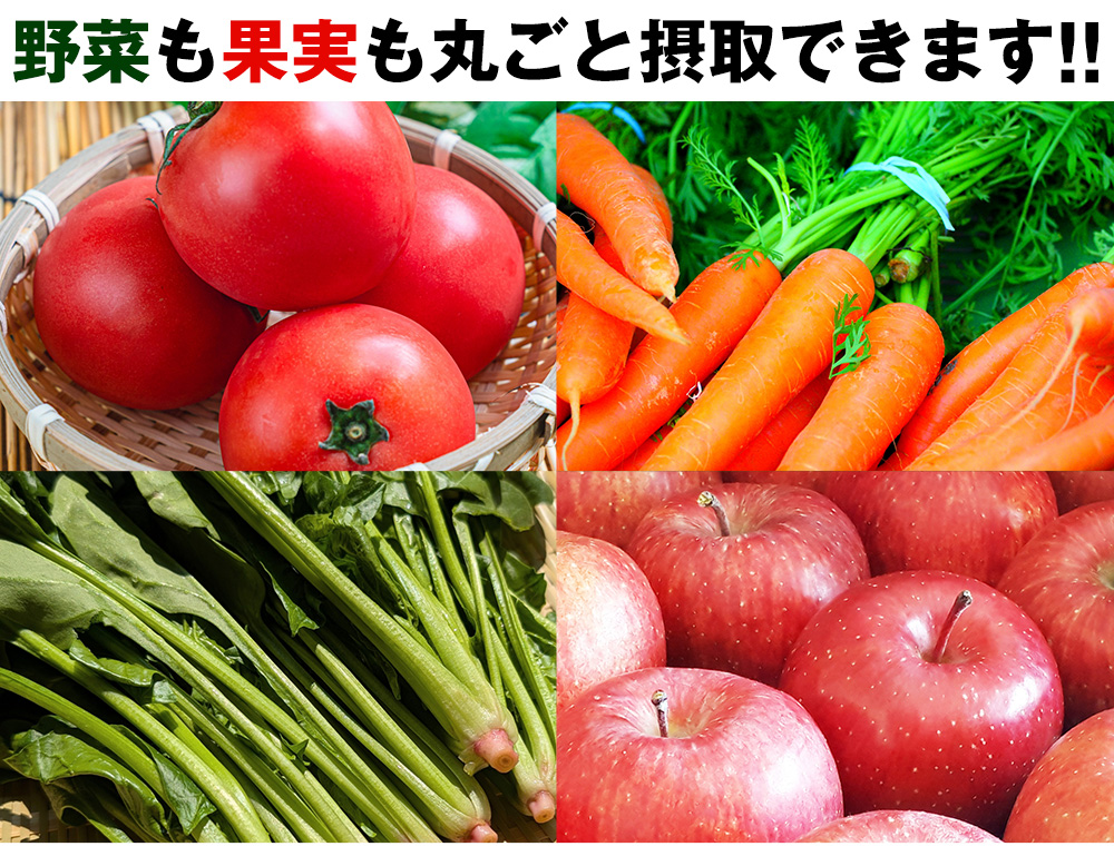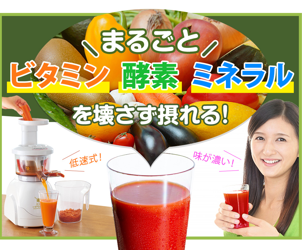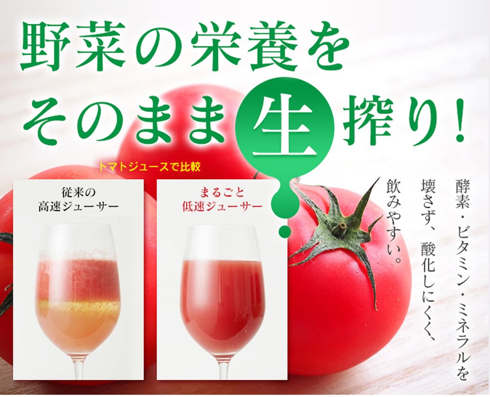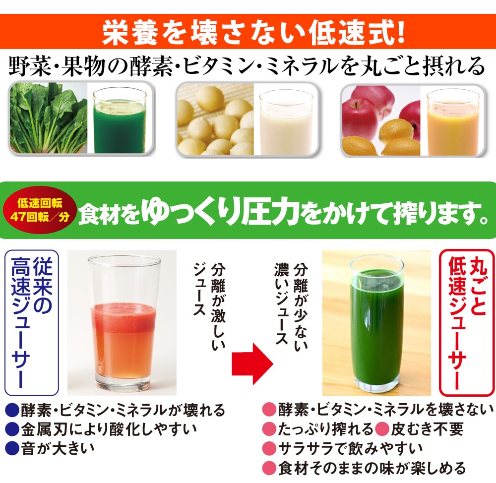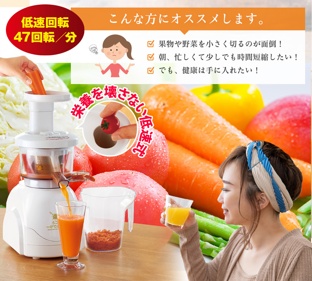 低速回転で野菜・果物の酵素・ビタミン・ミネラルを丸ごと補給! 酵素や各種ビタミン、ミネラルを壊さず、丸ごと摂れる「低速ジューサー」です。 <お好みの材料で簡単に作れます!> ・トマトジュース・にんじんジュース・リンゴ&レモンジュース・ほうれん草ジュース(水分の少ない野菜もOK) 低速回転で切らずに「搾る」! カッター刃を使わず、毎分47回転の低速スクリューでじわじわ圧力をかけて搾りだす『低速回転方式』を採用。高速ジューサーのような摩擦や衝撃がほとんどないため、食材の酵素やビタミン、ミネラルなどを壊さず、丸ごと摂ることができます。 <ジューサー機能> 野菜不足の解消や、毎日のビタミン補給に! <つぶし機能> 使い方はアイデア次第!ジューサー容器をつぶし容器に交換して食材を投入するだけ。低速回転で程よくかくはん&カットし、調理をサポートします。 茹でたじゃがいもとゆでたまごを入れて、ポテトサラダの下ごしらえに。 ※本品はフードプロセッサーとは異なり、細かいみじん切りなどはできません。 <低速スクリュー>ゆっくりやさしく圧搾 <新鮮ジュース>味が濃くて美味しいジュースがたっぷり!! <残り具>残り具も料理などに利用して有効活用! ●ミックスジュースやアレンジメニューも! ●レシピブック付 ●音も静か! <お手入れ安全&ラクラク> 容器やスクリューは簡単に取外せ、付属の掃除用ブラシで水洗い。カッター刃がないから安全にお手入れできます。