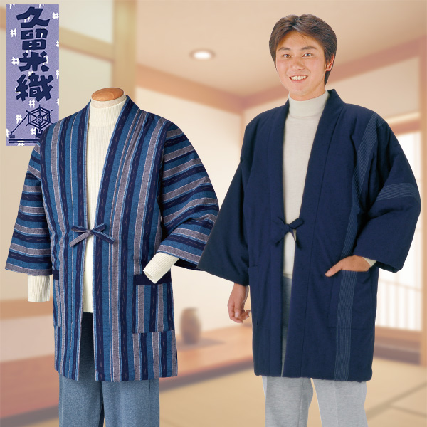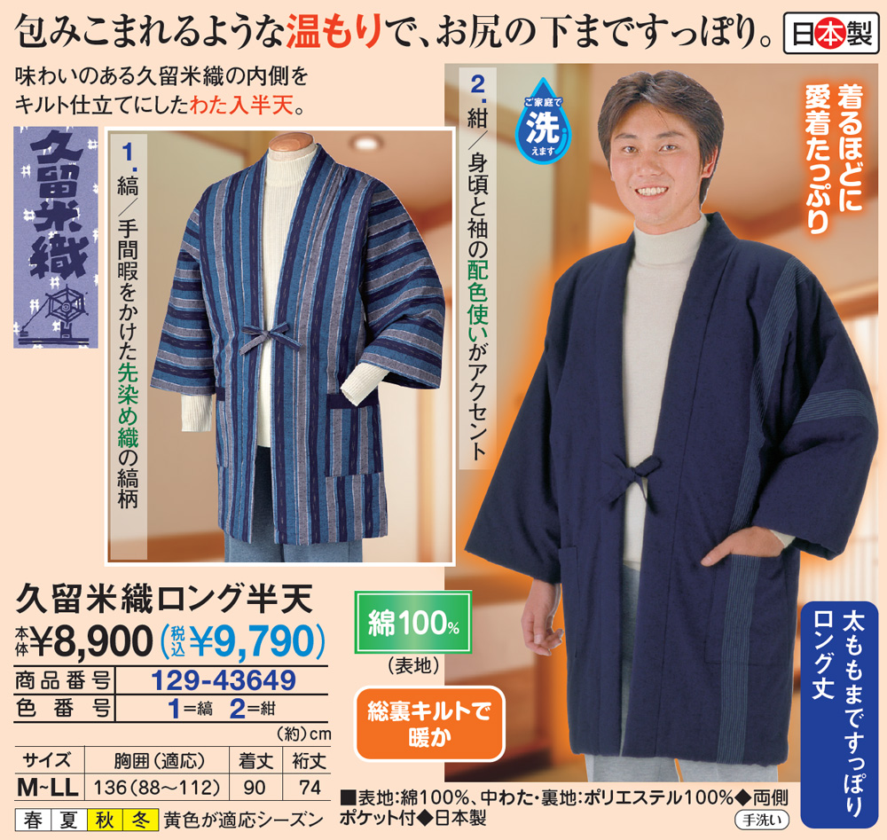 包みこまれるような温もりで、お尻の下まですっぽり! 味わいのある久留米織の内側をキルト仕立てにしたわた入半天。 着るほどに愛着たっぷり 太ももまですっぽりロング丈 総裏キルトで暖か 1.縞/手間暇をかけた先染め織の縞柄 2.紺/身頃と袖の配色使いがアクセント
