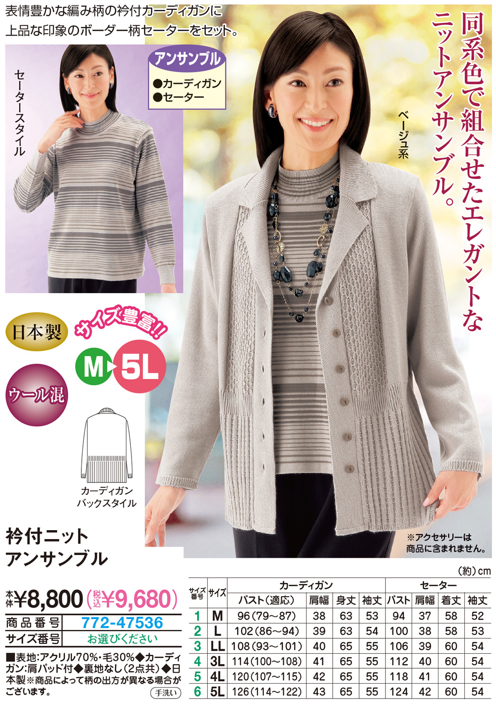 表情豊かな編み柄の衿付カーディガンに上品な印象のボーダーセーターをセット。