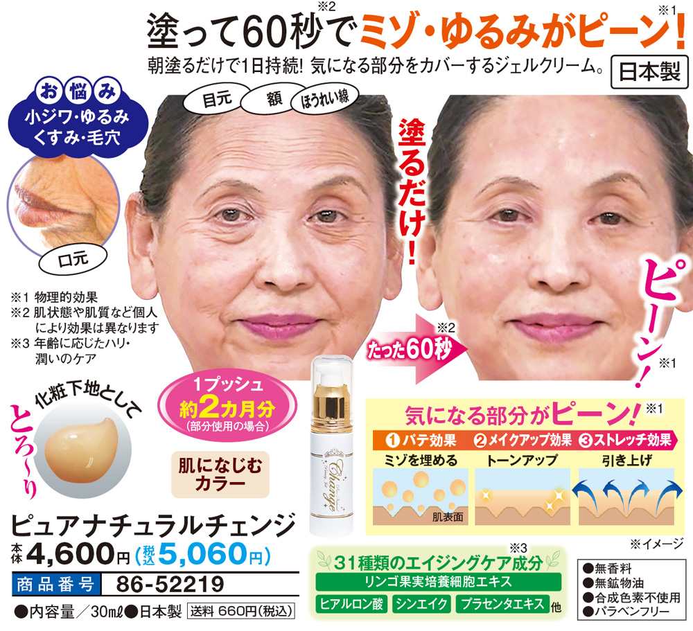 塗るだけで60秒※2でミゾ・ゆるみがピーン※1! 乾燥小ジワ、ザラザラ角質 秋冬の「乾燥肌」にご用心! 今から始める保湿ケアが大切! 【ミゾケア】 朝塗るだけで1日持続!気になる部分をカバーするジェルクリーム。 塗るだけ!たった60秒でピーン! 【お悩み】 ●小ジワ・ゆるみ ●くすみ・毛穴 ●目元 ●額 ●ほうれい線 ●口元 【化粧下地として】 とろ~り、肌になじむカラー。 1プッシュ約2カ月分(朝晩2回の使用時)。 \気になる部分がピーン!/ (1)パテ効果 ミゾを埋める (2)メイクアップ効果 トーンアップ (3)ストレッチ効果 引き上げ \31種類のエイジングケア(※3)成分/ リンゴ果実培養細胞エキス、ヒアルロン酸、ジイソケイ皮、プラセンタエキス 他 ●無香料 ●無鉱物油 ●合成色素不使用 ●パラベンフリー