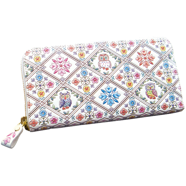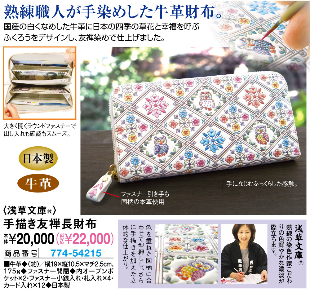 熟練職人が手染めした牛革財布! 国産の白くなめした牛革に日本の四季の草花と幸福を呼ぶ ふくろうをデザインし、友禅染めで仕上げました。 大きく開くラウンドファスナーで出し入れも確認もスムーズ。 手になじむふっくらした感触。 ファスナー引き手も同柄の本革使用。 【浅草文庫(R)】 熟練の染色作家こだわりの色鮮やかな濃淡が際立ちます。 色を重ねた図柄に合わせて型押しし、さらに手描きを加えた立体的な仕上がり。