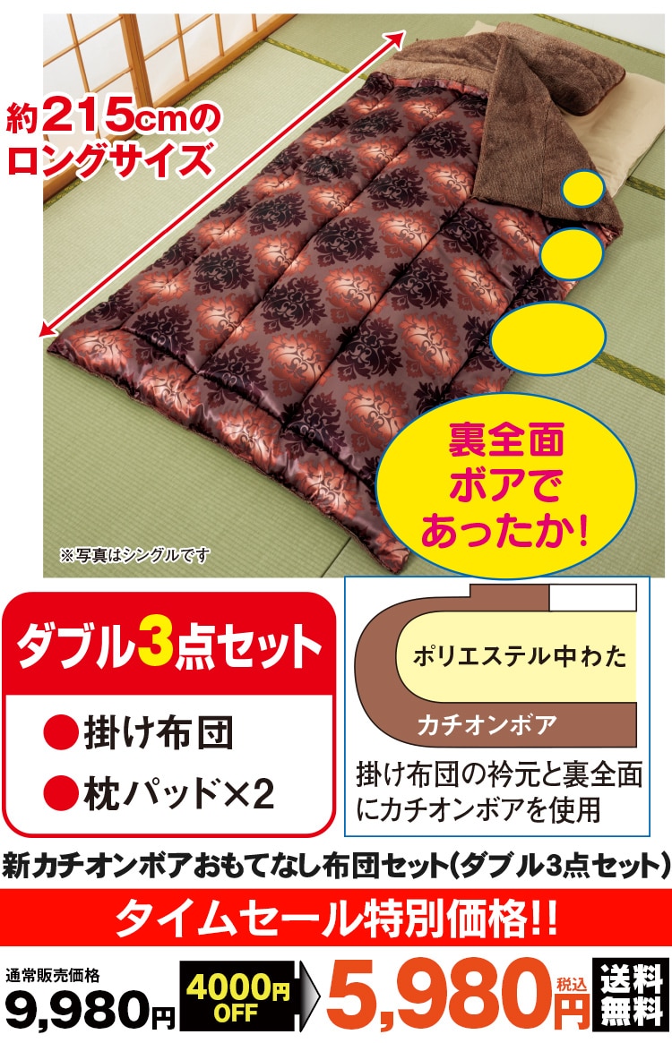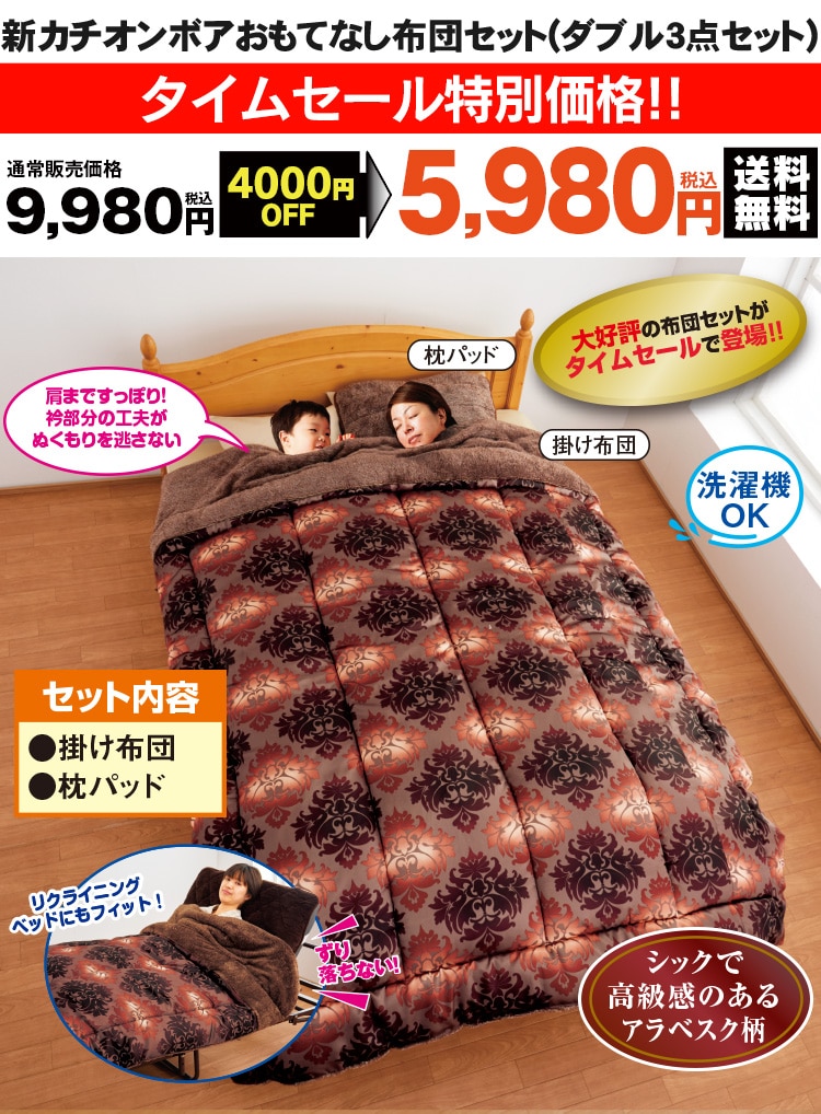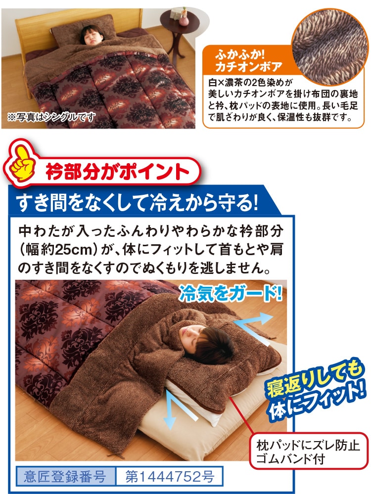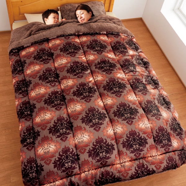 肩まですっぽり暖か! 掛け布団+枕パッドのおもてなし布団セット! ●良質素材でぽっかぽかあったか寝具 ●大好評の布団セットが新柄で登場!! ●肩まですっぽり!衿部分の工夫がぬくもりを逃さない ●親子で寝てもすき間ができずにぐっすり! ●寝返りしても体にフィット! ●リクライニングベッドにもフィット! ●裏全面ボアであったか! ●掛け布団の衿元と裏全面にカチオンボアを使用 ●シックで高級感のあるアラベスク柄 ●衿部分がポイント 【すき間をなくして冷えから守る!】 中わたが入ったふんわりやわらかな衿部分(幅約25cm)が、体にフィットして首もとや肩のすき間をなくすのでぬくもりを逃しません。 【ふかふか!カチオンボア】 白×濃茶の2色染めが美しいカチオンボアを掛け布団の裏地と衿、枕パッドの表地に使用。長い毛足で肌ざわりが良く、保温性も抜群です。 ●ダブル3点セット ○掛け布団 ○枕パッド×2