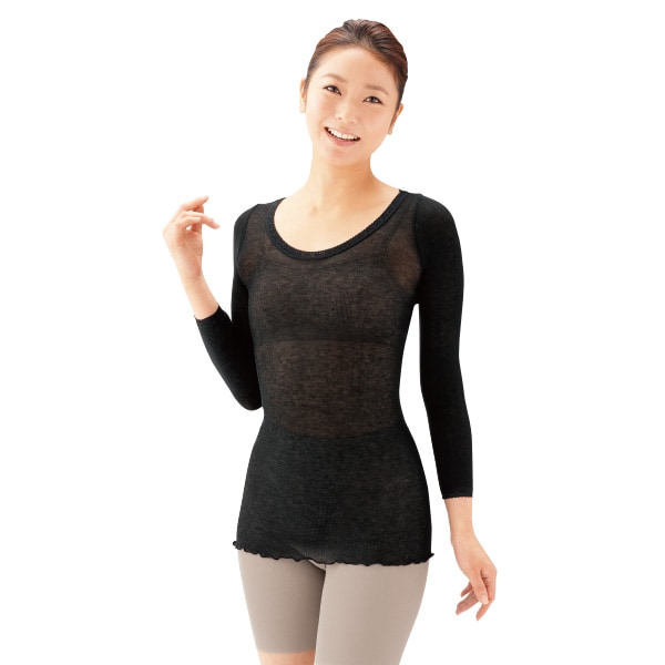 タートル【サイズ(約)】 適応バスト、肩幅、総丈、袖丈 <M~LL>(79~101)cm、22cm、90cm、50cm 丸首【サイズ(約)】 適応バスト、肩幅、総丈、袖丈 <M~LL>(79~101)cm、26cm、71cm、50cm ■綿35%・アクリル31%・キュプラ19%・シルク12%・ナイロン2%・ポリウレタン1%、レース部:ナイロン・ポリウレタン ◆日本製