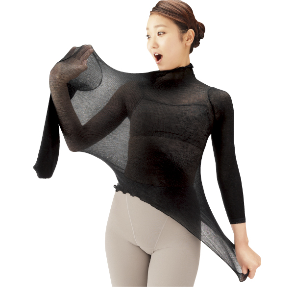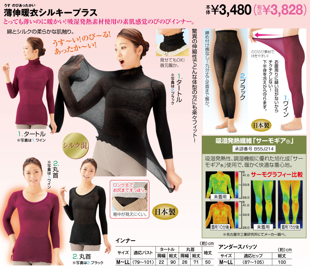 とっても薄いのに暖かい!吸湿発熱素材使用の素肌感覚のびのびインナー! 綿とシルクの柔らかな肌触り。 驚異の伸縮性でどんな体型の方にも楽々フィット! 見せてもOK!首元暖か。 うす~い!のび~る!あったか~い! 【ロング丈でお尻まですっぽり。】 背中が見えにくい。 【吸湿発熱繊維「サーモギア(R)」】 吸湿発熱性、調湿機能に優れた旭化成「サーモギア(R)」使用で、暖かく快適な着心地。 ◆承認番号:B55J214 ●シルク混